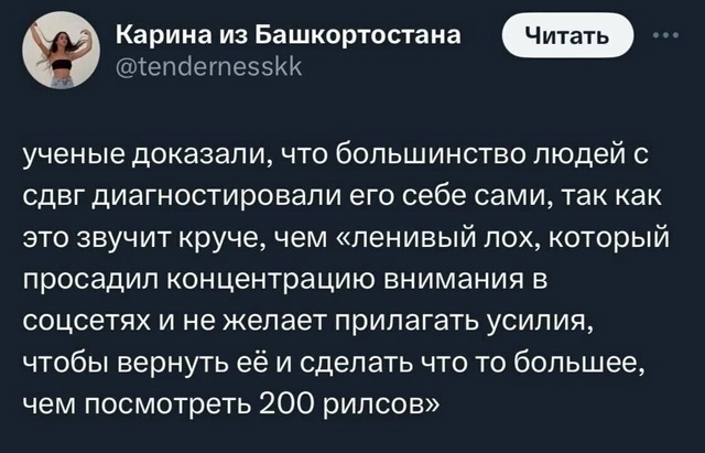 Постит фотки где она потасканная но в верном гидрике под мамкиным бальным платьем времен СССР будто фуру кирпича выгрузила единолично. Пишет какие-то распорядки дня как она занималась наукой и после сразу посты на бусти где она полощит сифосзную пизду а при чем тут наука?