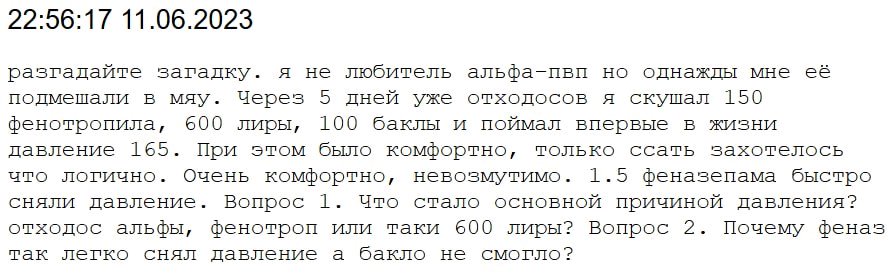 13.04.2024 0,5 мефа сразу? в рот? 18.06.2023 меня друзья научили нимесил+меф 18.06.2023 мне норм меф или ешка 1 и 3 день, потом 2 нед перерыв 17.06.2023 антидепры, лира, бакло, изредка меф 24.05.2023 мне базовый стэк это ешка амф и конопля 29.04.2023 у нас было по марке на человека и немножко мяу, который мы слизывали со швейцарского ножа микродозами по 20-30 мг. И много баклы. 11.06.2023 я пробовал в 2018 установить с альфой отношения, валил её побочи баклой, феназом, коноплёй и всё равно почти единственный юзкейс был секс (с коноплй) и всё равно отходосы говно долгое 18.08.2023 Зато лсд с 75 баклы позволяют поднять мяу на микродозах ночью 15.06.2023 0 ч 75 баклы, 1 ч 1/4 марки, 3 ч затемно 50 мг мяу во рту сосать. и будет трип выше чем полнодозный меф 11.06.2023 день 1: 400 мяу в нос + немного фенотропила, всё круто... день 2: 200 мяу в нос просто проверочно день 3: 700 мяу в рот и немного в нос... 15.05.2023 а я щас на энегетике+лира+бакло+микролсд ебался с тян 11.12.2022 ...в трипе лира+лсд+бакло+хималь 19.11.2022 я полинаркоман