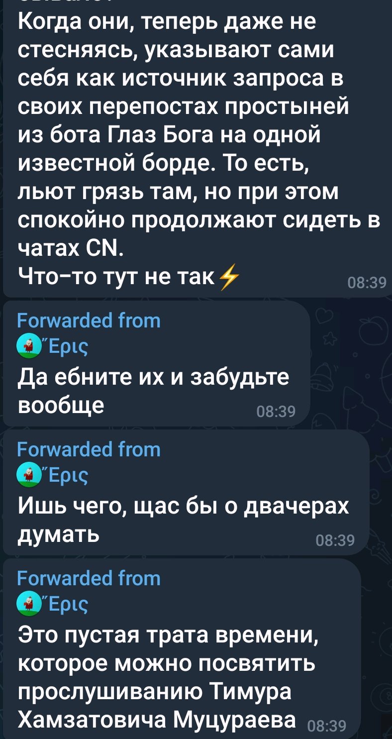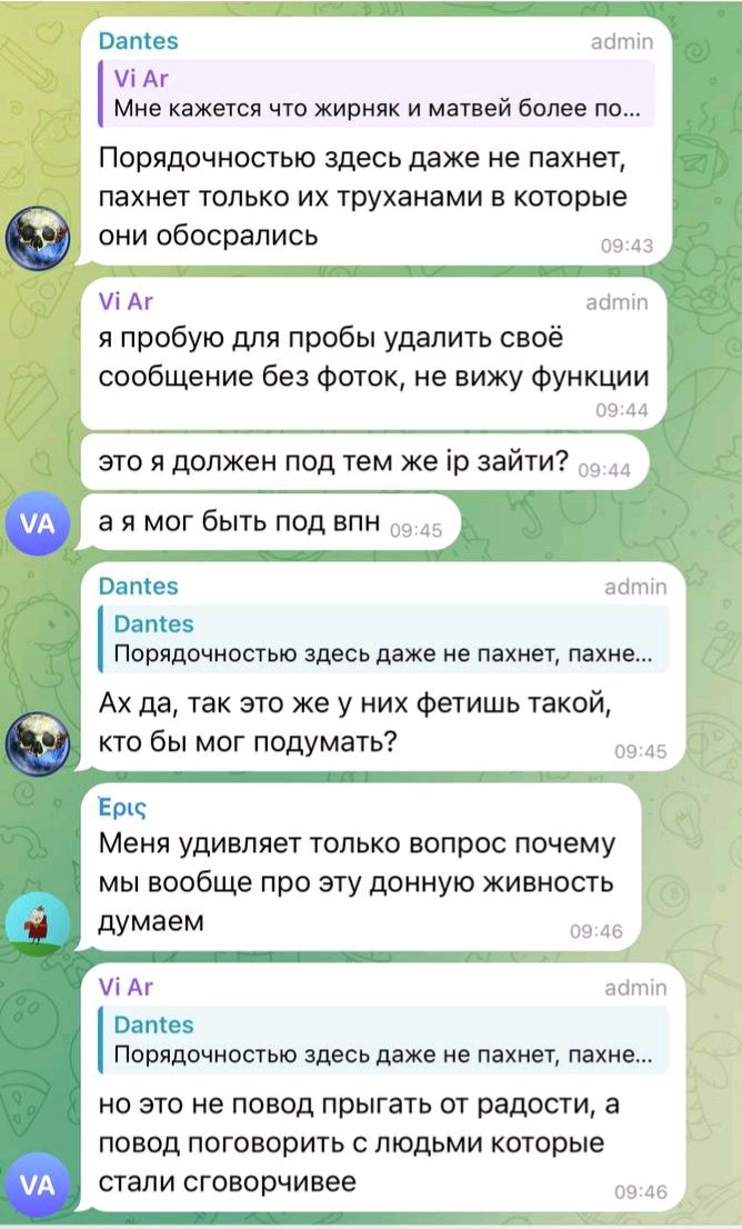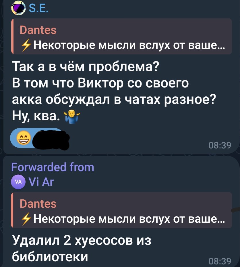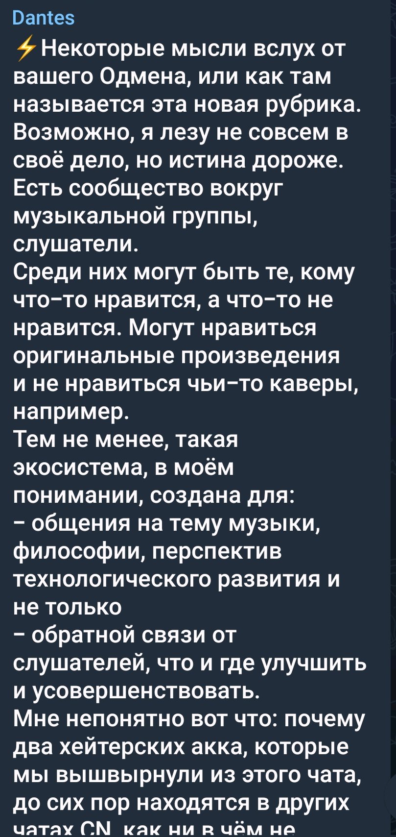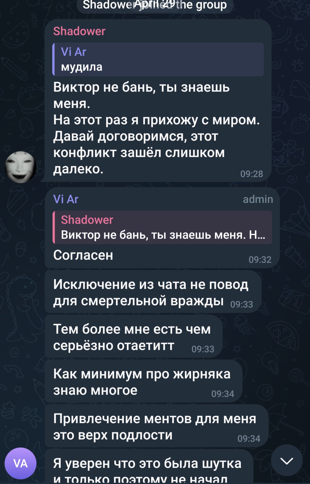 Виктор Мефедронов: Если ко мне придут менты то вы мои смертельные враги. Потому что в тюрьме я с высокой вероятностью умру, а вину разделят топовые хейтеры. Классно будет звучать - аспирант по физике Артём за то что его выгнали из чата посадил за старые переписки кандидата по физике Виктора, который умер в тюрьме. Посотрудничал с правоохранительными органами РФ против очередного неугодного музыканта