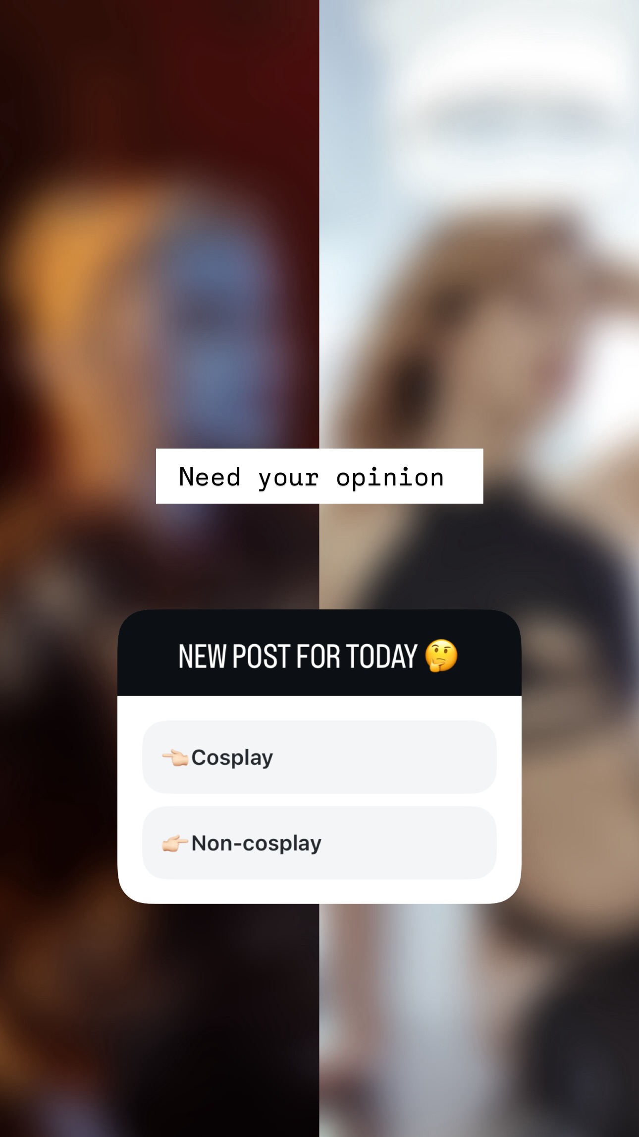 >>1805866 В голосину. То есть, какой-то опрос в сторис - показательный результат? И даже в нем вопрос поставлен неверно: что значит "не косплей" для обычного голосующего? Вот ты наверное считаешь "некосплеем" такое >>1806148, а это вообще-то косплей. Так что для чистоты опроса Нарга должна была спросить "косплей или фансервис", да и то это будет доказывать практически нихуя.