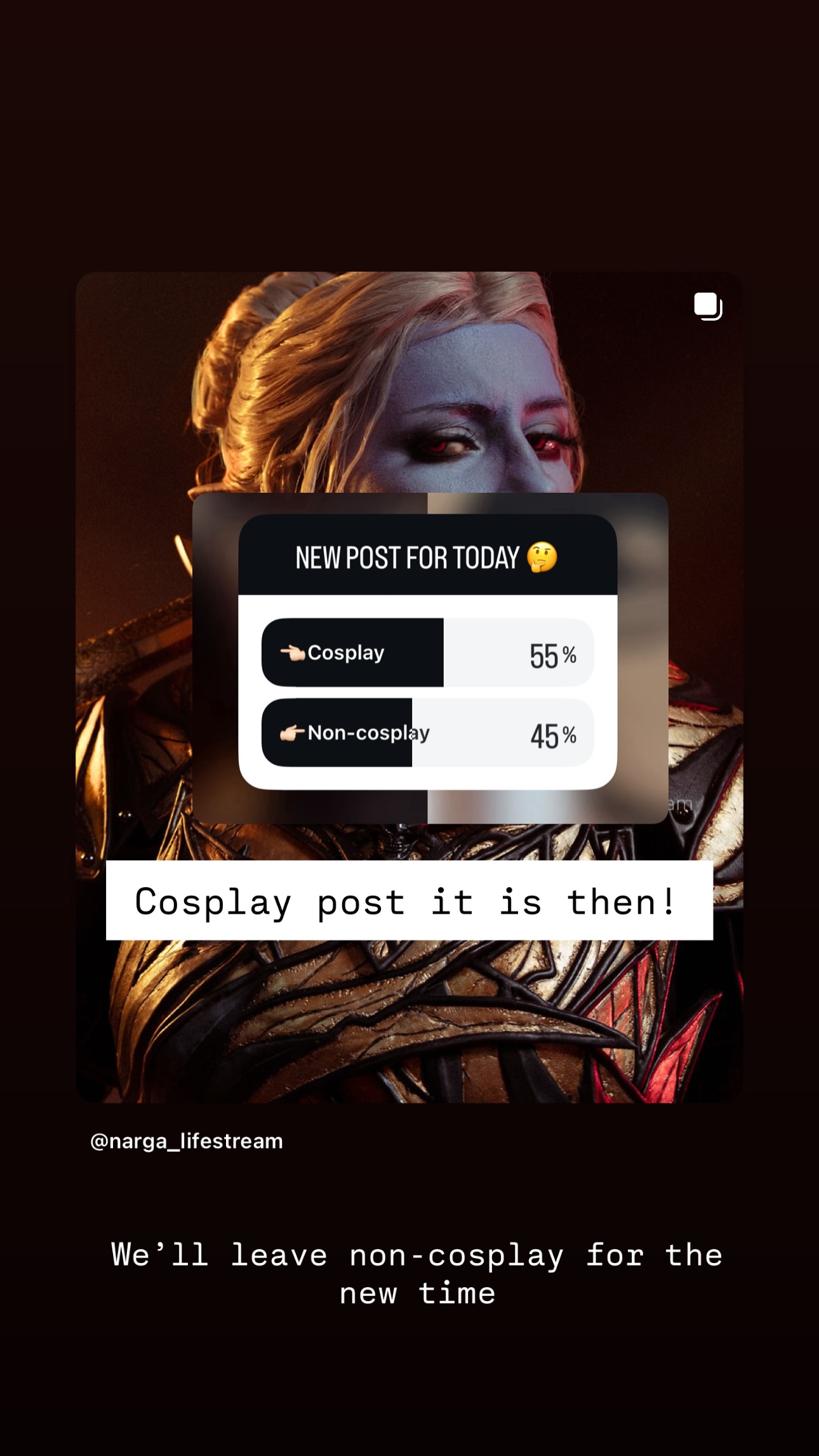 >у нее на фоне баба в доспехах, поэтому я делаю вывод что голосовали за доспех А я делаю вывод что голосовали за Минтару в трусах, потому что это тоже косплей. И что?