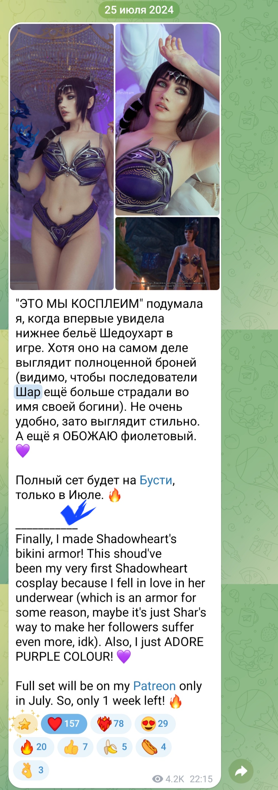 Итак, на дворе 2025 год. Наташа не завязала с косплеем (хотя и отошла от тематики ВоВ), не перебралась за бугор, избежала бана Инстаграма и начала все больше коллабиться с другими косплеершами. Основными фэндомами все прочнее становятся Ведьмак и Baldur's Gate. Мы же продолжаем обсуждать, насколько хороши ее новые образы, повлияло ли появление фансервиса на качество каноничного косплея, заслуженно ли звание "лучшего крафтера России", и все связанные с этим темы. Ну и конечно, не забываем выкладывать красивые фотографии и видео.