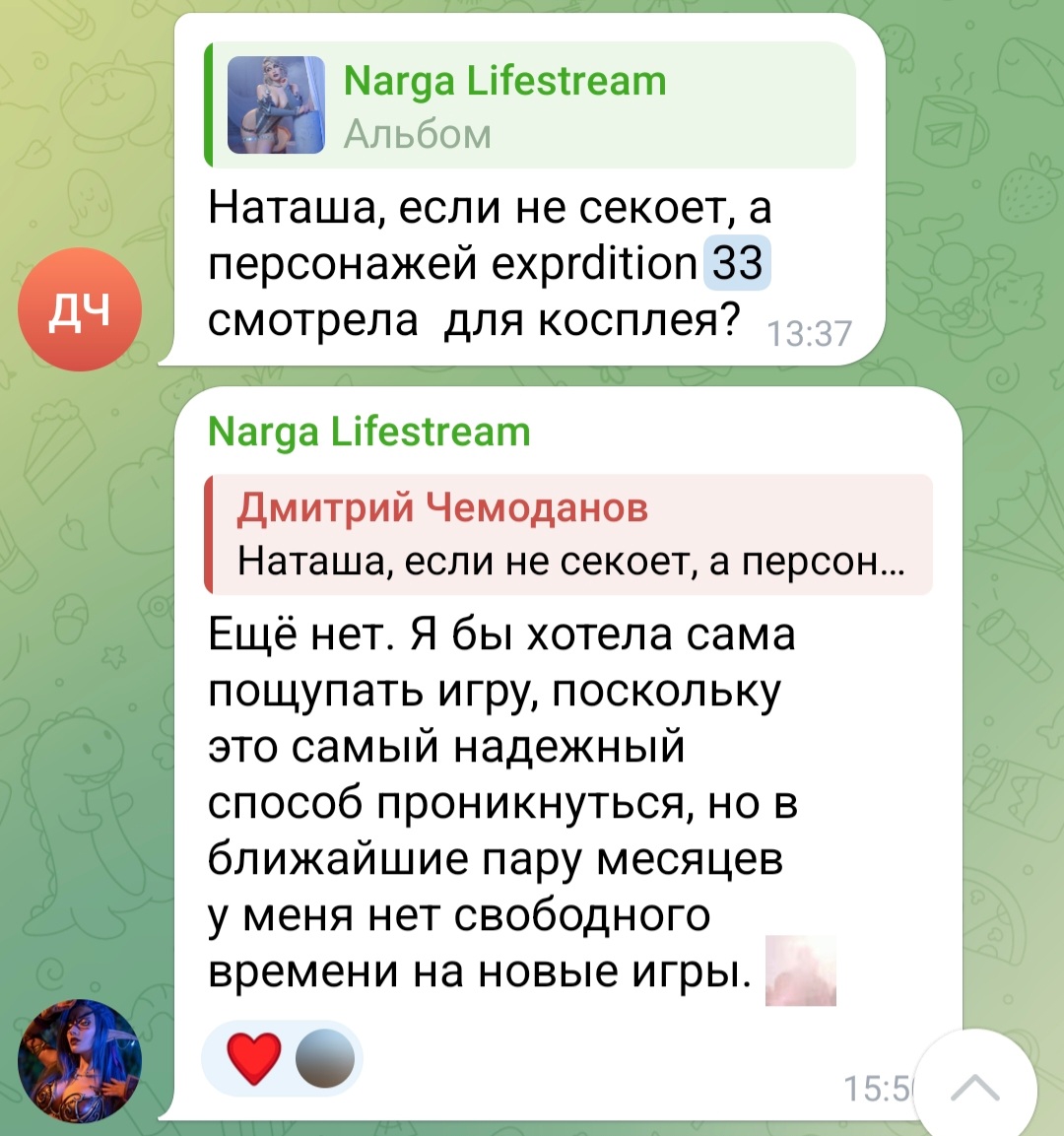 Там просто сидит по ту сторону светлый человек, верящий в лучшее. Нарге повезло, что он ее первой открыл. Я таких встречал. Реально челики получают удовольствие от своего избранного косплеера.