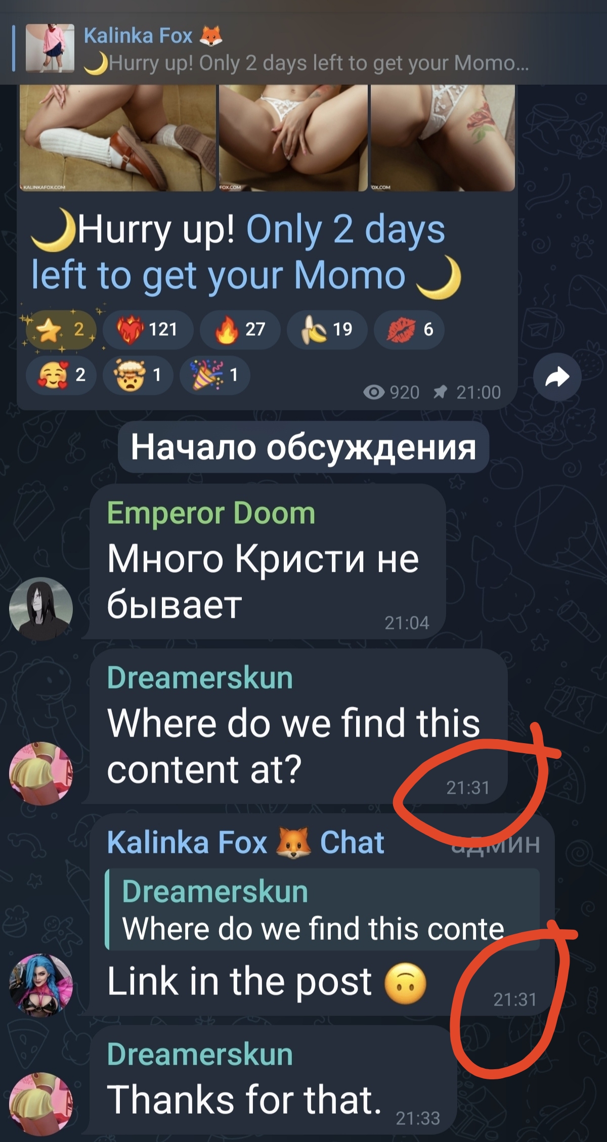 Новости: На калининско-фоксном направлении полнейший штиль. С апреля по август 2023 произошло рекордно малое количество сливов, а те что были, ни пизды, ни очка, ни вразумительного качества фотокарточек не заимели. Патреон убрал возможность ставить цели, и замануха "запилю видосы за 600 подписчиков" прекратила своё существование. Не велика потеря для Финк, тем более самокопание и отсутствие возможности прибегнуть к фотошопу лишний раз, видимо, не позволяли ей порадовать фанатов и двачеров в этой стезе. Помянем. В 2025 начала выкладывать короткие видео, где использует фильтры на все 146% и ужасно кривляется, хотя имела ютуб канал с 500 тысячами подписчиками. Ну, а поскольку уныние это смертный грех, то не унываем, пацаны, ведь покамест жив этот тред, жив и огонёк надежды о светлом будущем и зияющем очке, которое, в силу недоступности и обсуждений, уже заслуженно стало элементом преданий, сказаний и легенд.