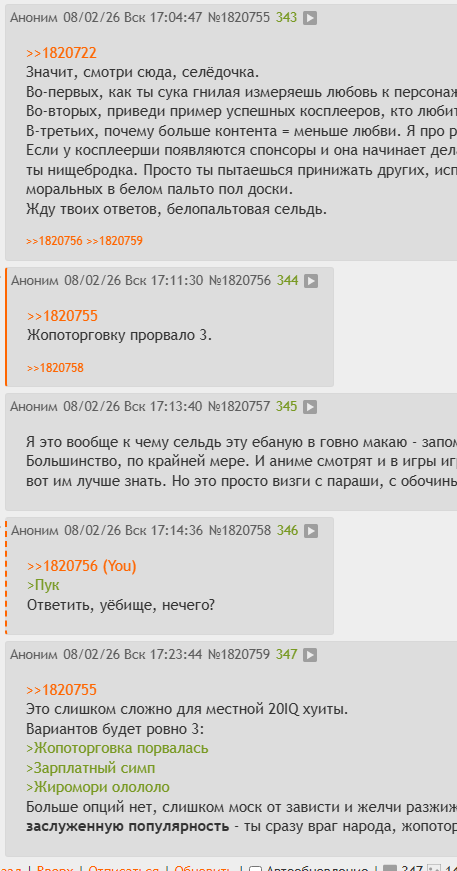 Там сорок сороков снова исполняют. Назвали всех 18+ косплеерок шлюхами и обещают их всех наказать по 242. Косплеерши уже планируют им ответить. Болеем за обе команды