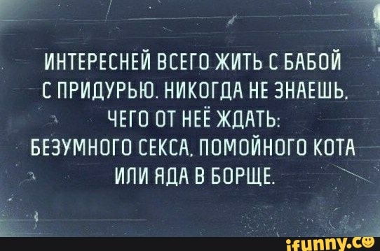 Была баба с придурью - доходило дело до секса. и как только я скорострельничал, она менялась полностью ....из нормальной тянки превращалась в какую то просто невыносимую гундящую бабку! Сразу скандал, истерика. обвинения что я скорострел )) что не опытен и порывается сразу уйти! Скорострельность её прям выбешивала Через пару дней - норм) типо ничего не было.... С будущей женой когда секс был - всё наоборот, ну если выстрелил быстро. ну и что , да и пох)