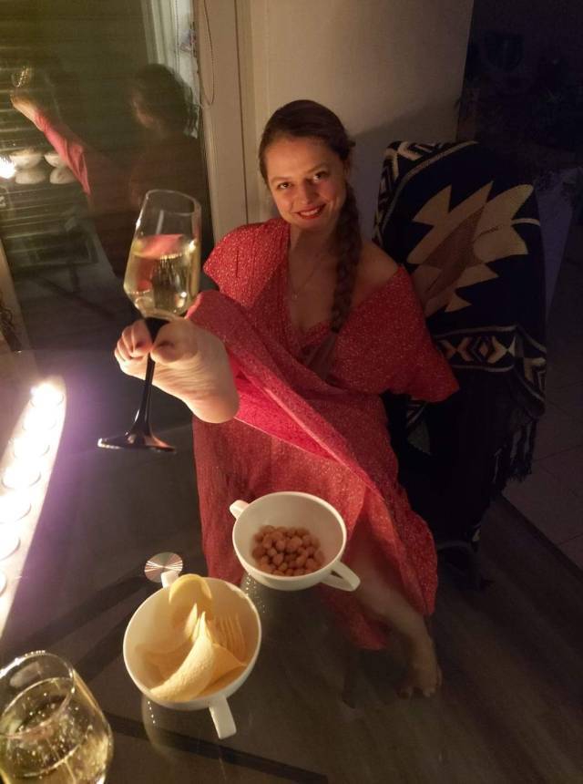 Представьте, она все пытается делать своими босыми ногами. Например, приходите в ресторан. А она снимает ботинки и ароматную ногу после ходьбы кладет на стол ей берет бокал вина