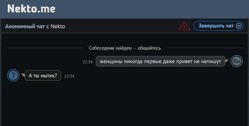 Короче, зарегался в Анон Чате. Взял премиум. Начинаю поиск, алгоритм находит тянку. И как только открывается окно чата, собеседник завершает чат. Без вариантов, даже "Привет" не успеваю написать. Бывалые аноны, что я делаю не так?