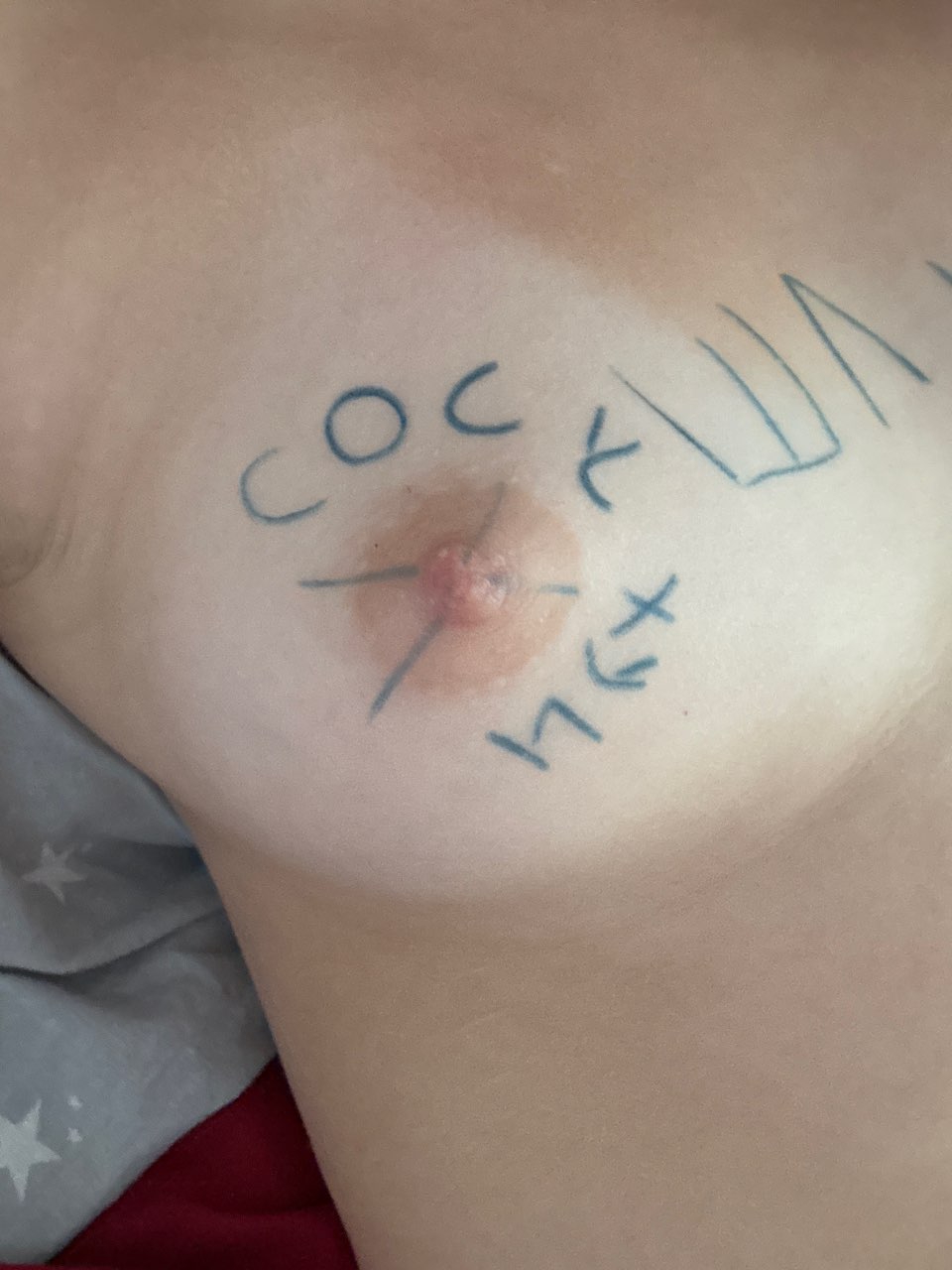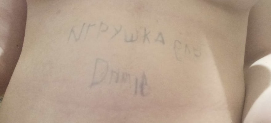 Пыталась написать на своем теле "Игрушка для Димы", но что получилось видите сами. Глупенькая шлюшка даже это не смогла сделать, но ведь мы с вами ценим её старание, да?)