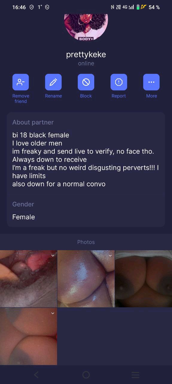 Один мой друг рассказывал про своего знакомого, который в этом чате дрочил с 15-летней девочкой, довел ее до трясущихся оргазмов на видео. А потом зассал, снес переписку, аккаунт и приложение и сидит на очке, ведь при желании его легко можно вычислить и организовать небо в клеточку. Так то.