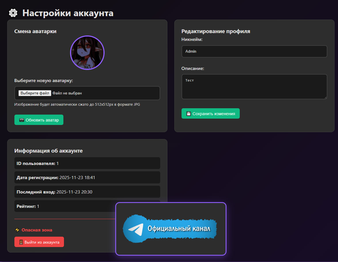 Но это не все! - Добавлен топ пользователей (по рейтингу "лайки - дизлайки = рейтинг" со всех постов) - У каждого поста отображается профиль (если загрузили пикчу без аккаунта, то Аноним) - Админ, модераторы и донатеры имеют галочку! (если вы будете донатить, то напишите свой ник или ID)