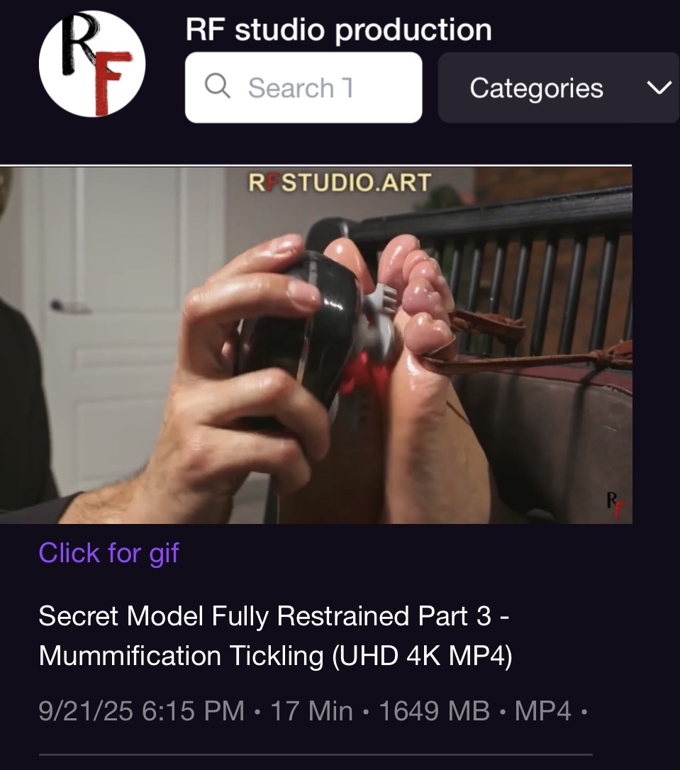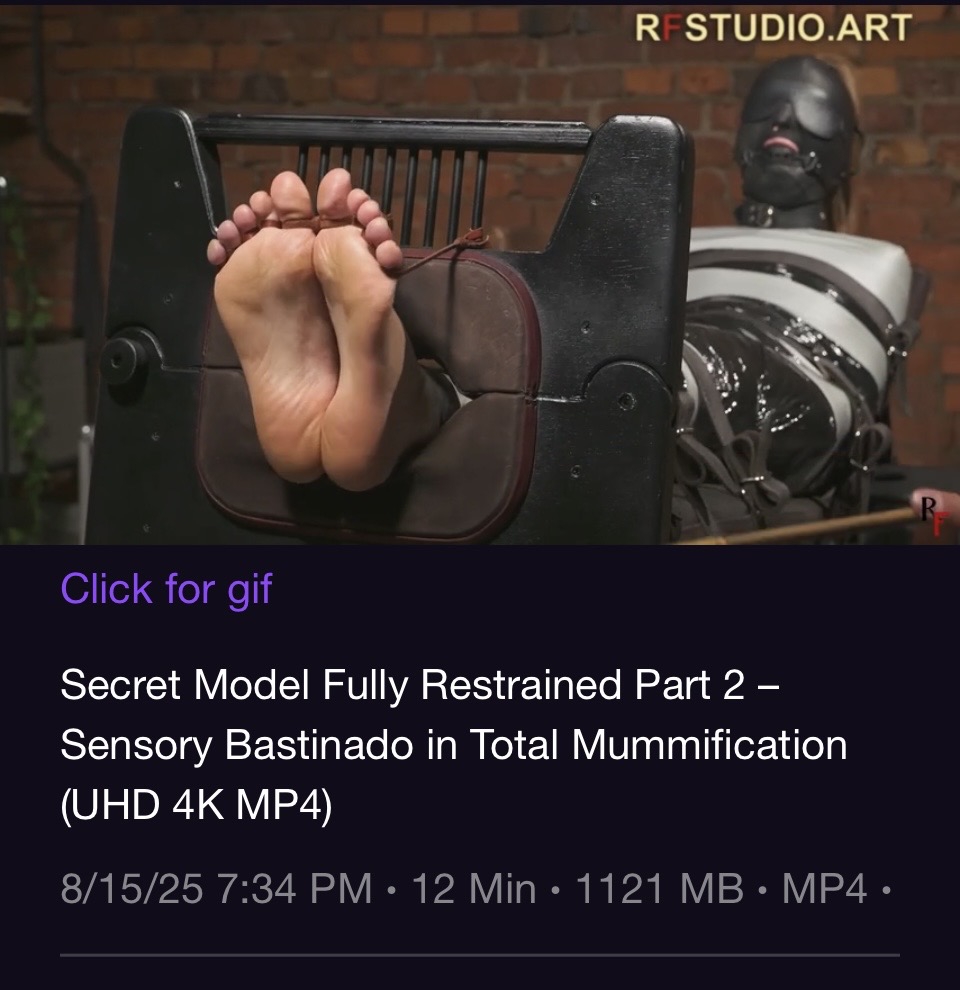 В этом первом ролике Секретная модель полностью мумифицирована и прикреплена к верстаку. Единственные открытые части ее тела - это босые ступни, от которых исходил легкий, естественный аромат, который я помню до сих пор. На ней капюшон из сенсорной кожи и сумка-мяч, она лежит в ожидании того, что произойдет дальше, полностью погруженная в происходящее.