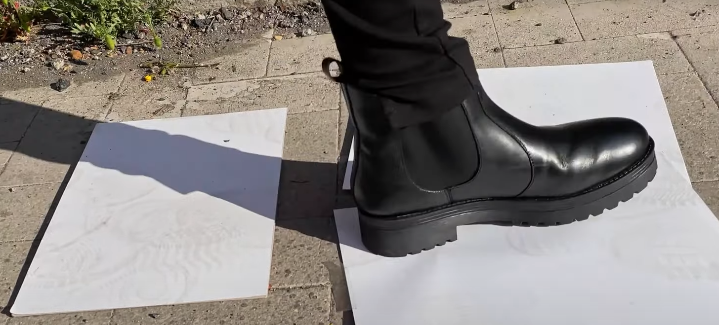 ещё это видео дсоставило, там правда просто лист, но принты подошв прикольные остаются. идеально для распечаток фото моей бывшей бы подошло, чтоб на них постепенно становилось всё больше отпечатков женской обуви и грязи с неё. а чтоб люди не отодвинули их с прохода, можно распечатать на приклеивающейся с одной стороны бумаге. вау!!! https://www.youtube.com/watch?v=2H6IkPfUcwo