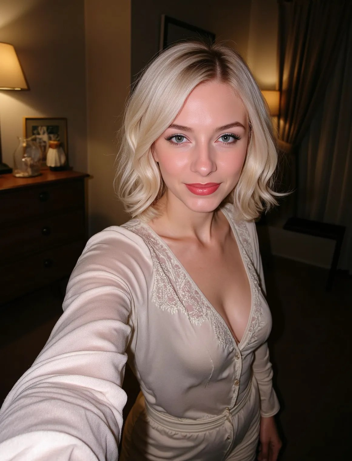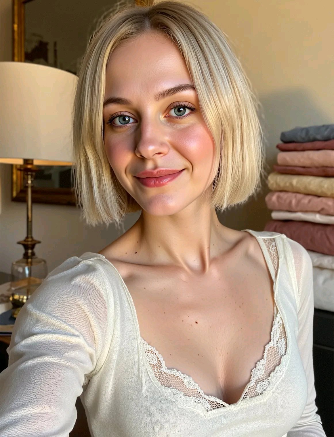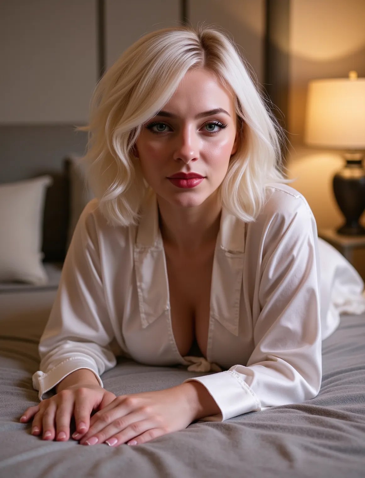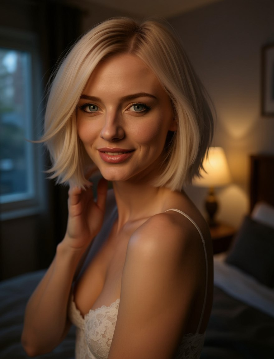 Subject: A single solo woman in her late 20s, slender graceful build, platinum blonde bob hair cascading softly, striking blue-green eyes with seductive gaze.