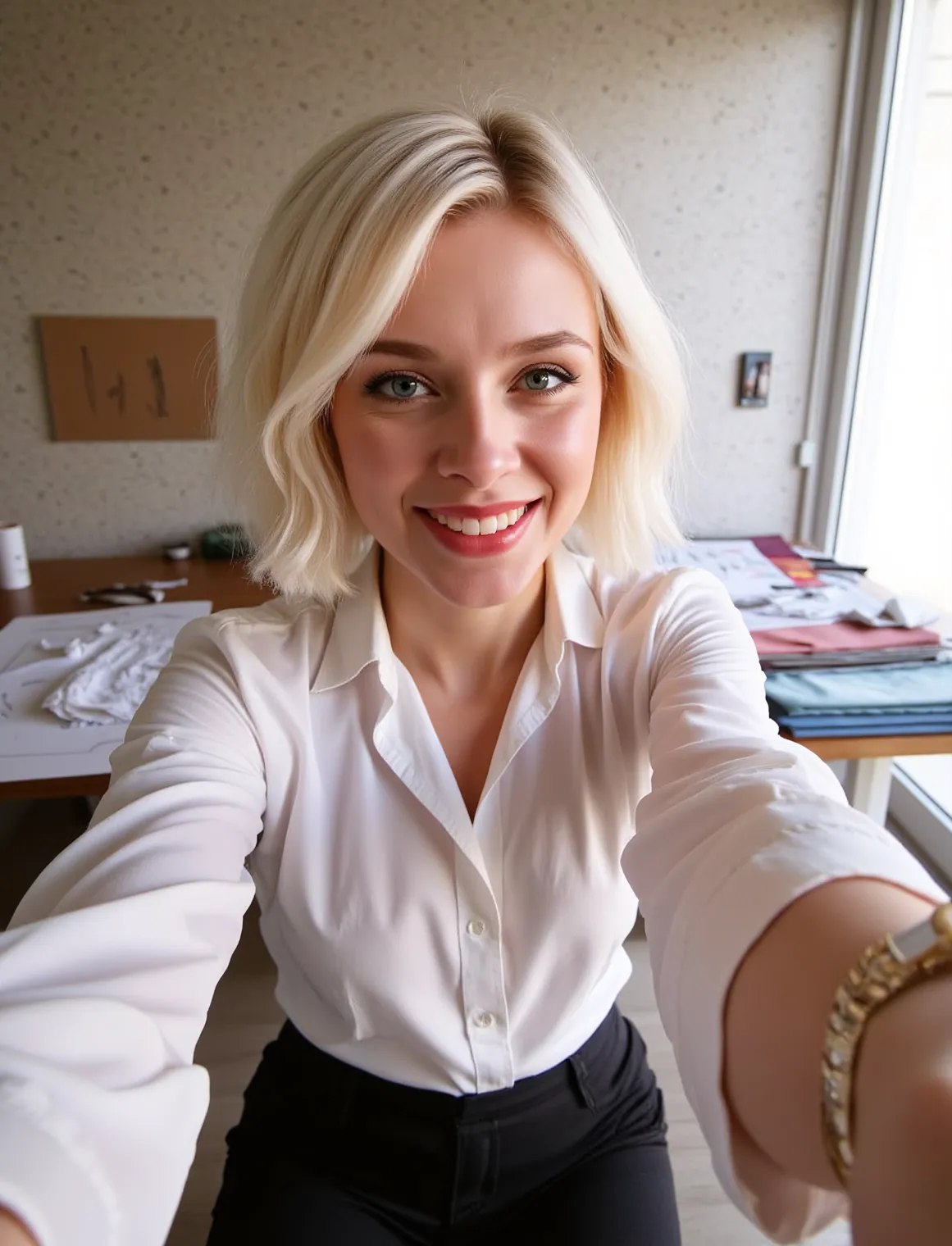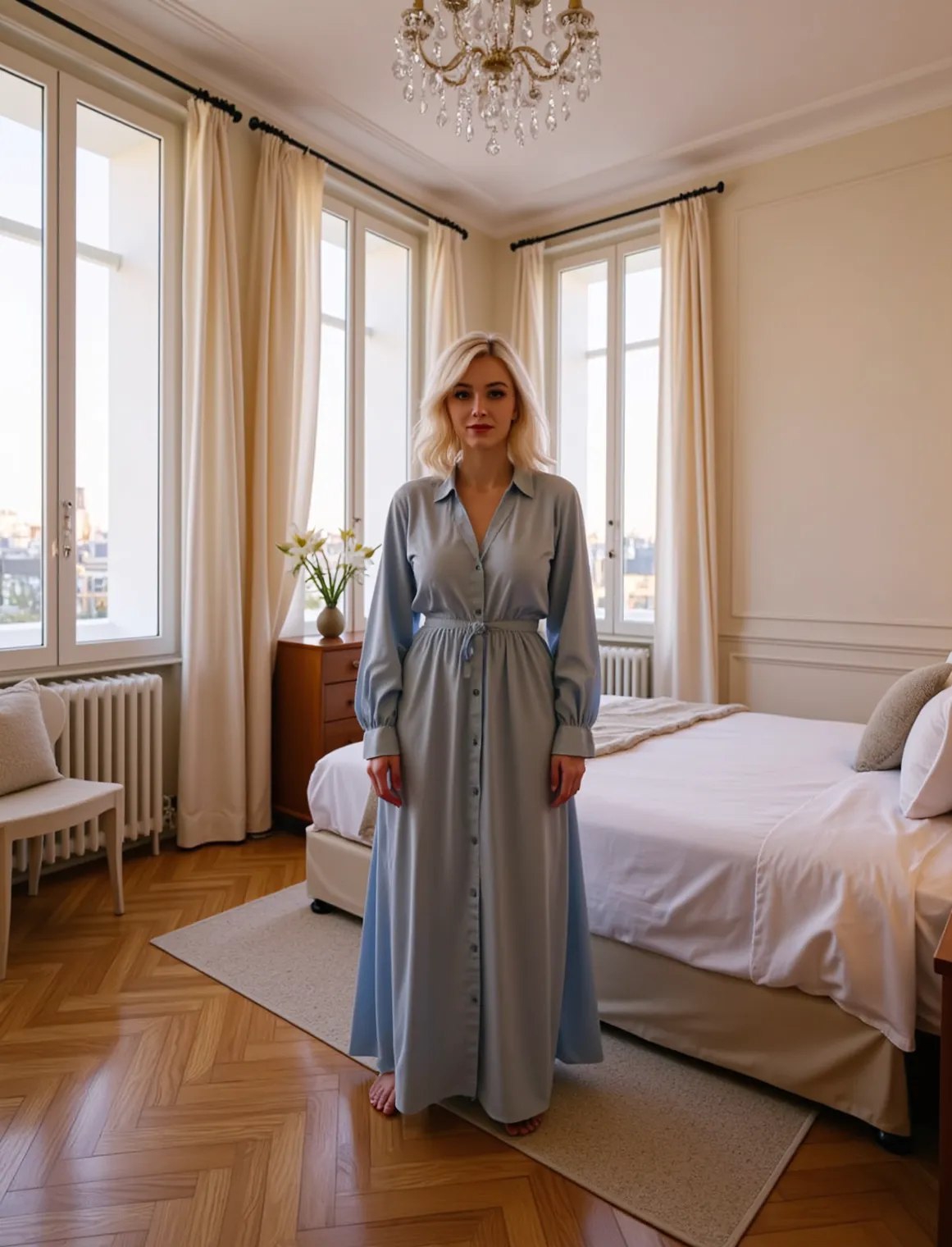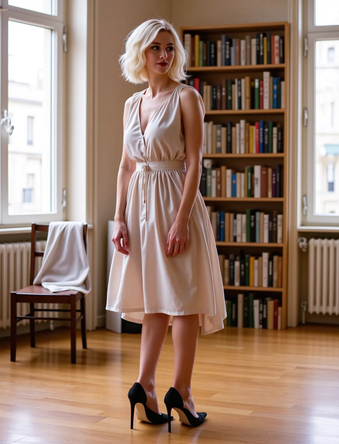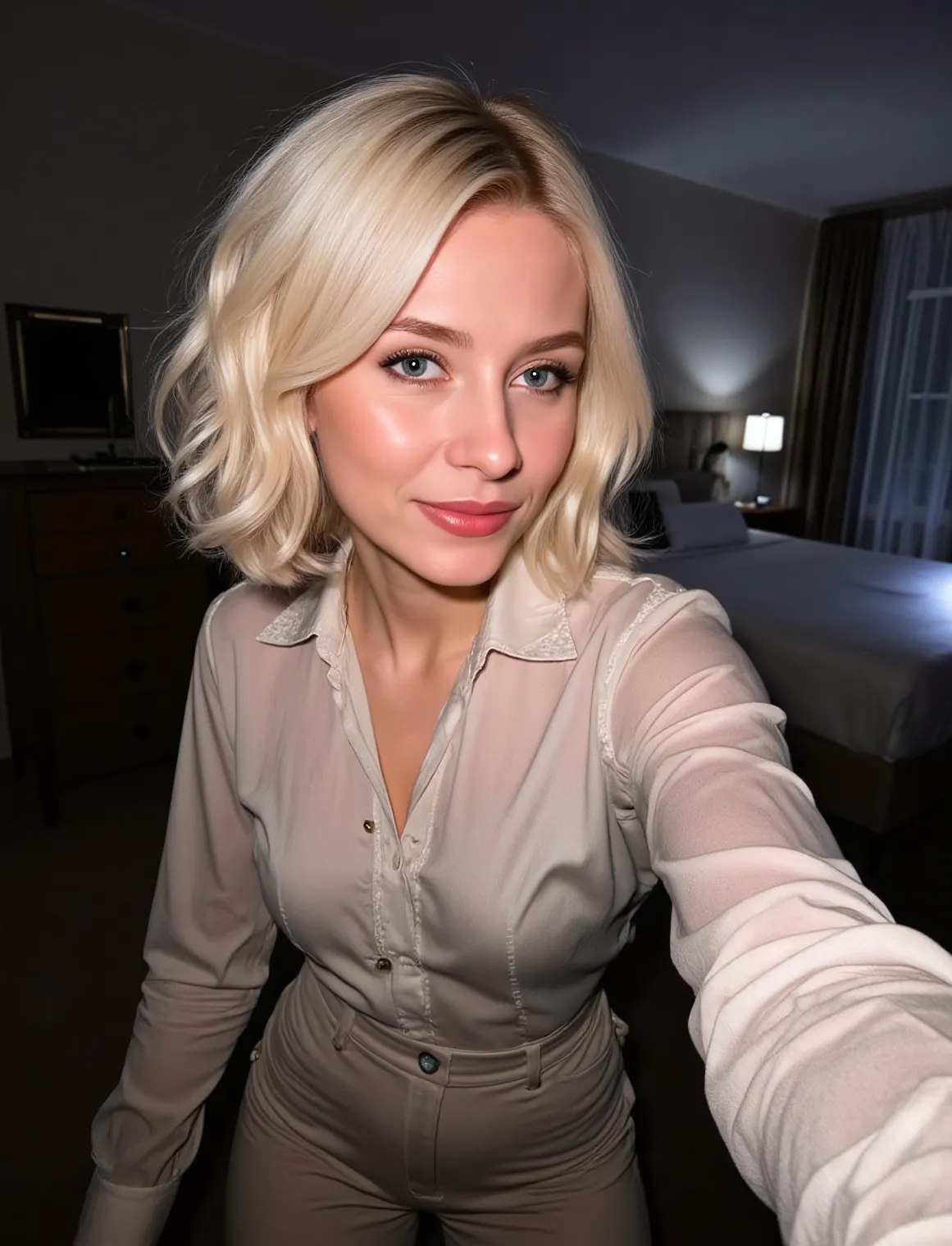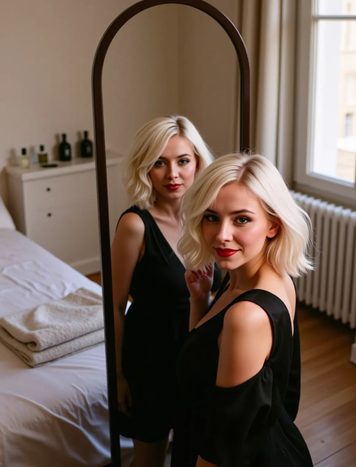 Subject: A single solo woman in her late 20s, slender graceful build, platinum blonde bob hair cascading softly, striking blue-green eyes with seductive gaze.