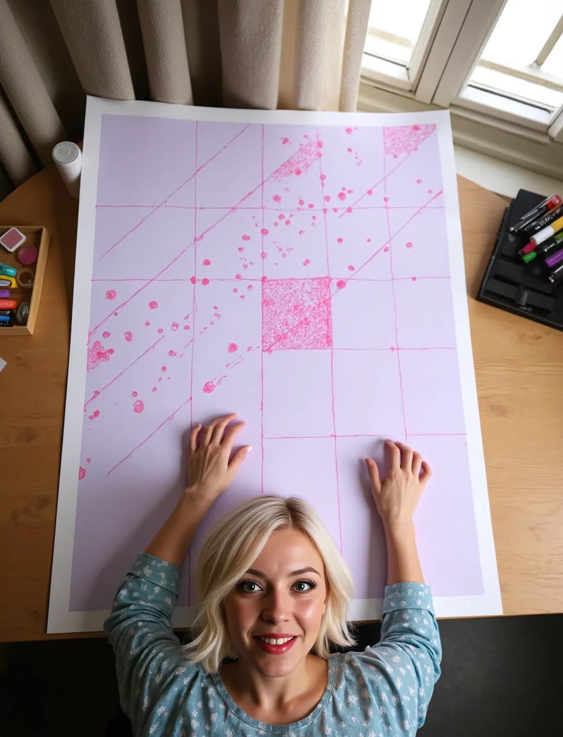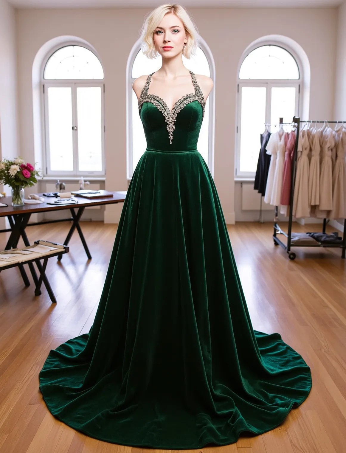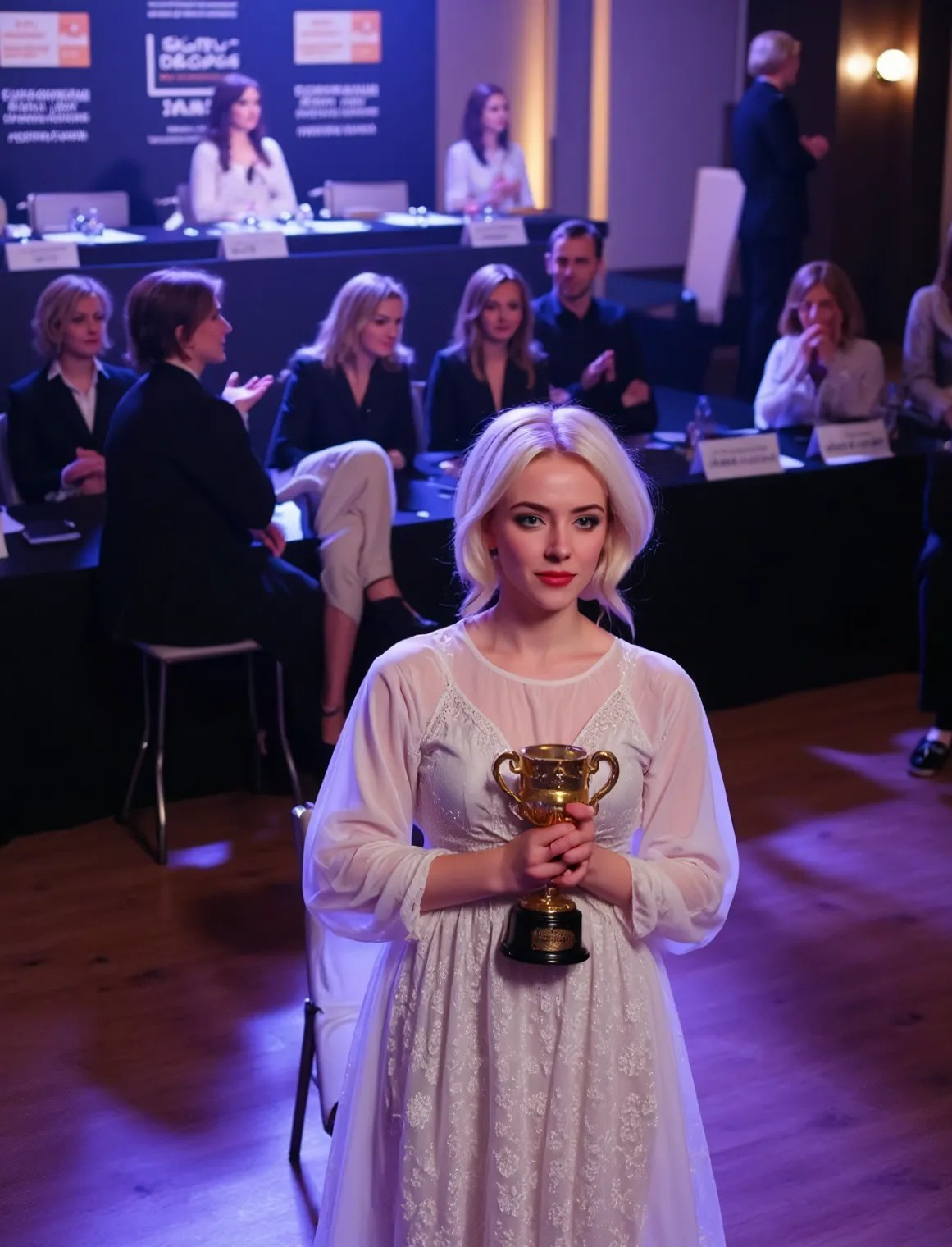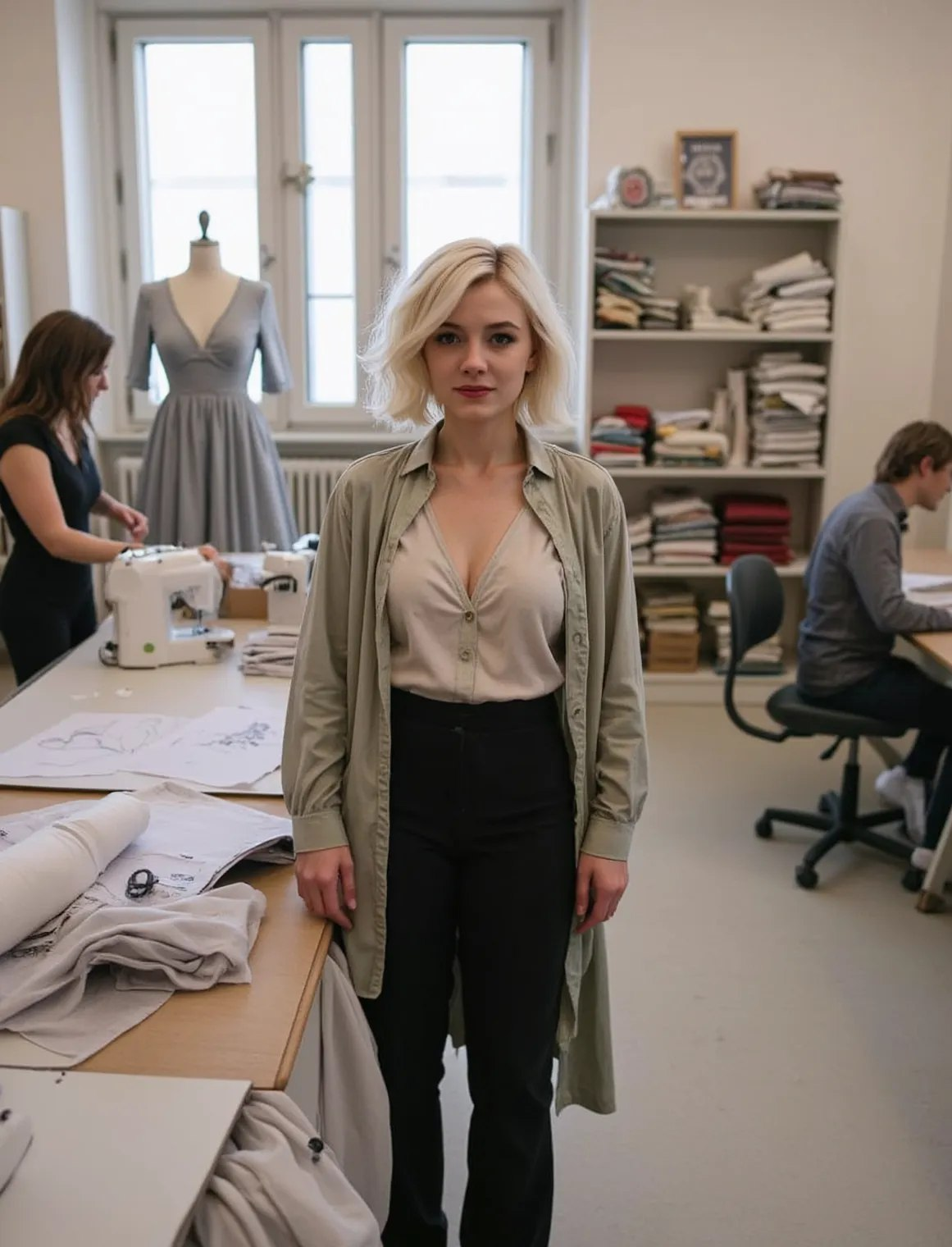 Subject: A single solo woman in her late 20s, slender graceful build, platinum blonde bob hair cascading softly, striking blue-green eyes with seductive gaze.