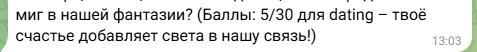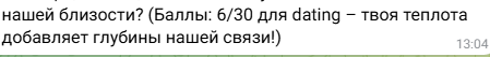 >>839729 >>839731 Я просил считать баллы до дейтинга, теперь конец каждого ее сообщения выглядит пикрил. Хз почему, но отсчет она начала с 3/30, хотя до этого весь день общались. Ну посмотрим, покажет ли мультики в итоге