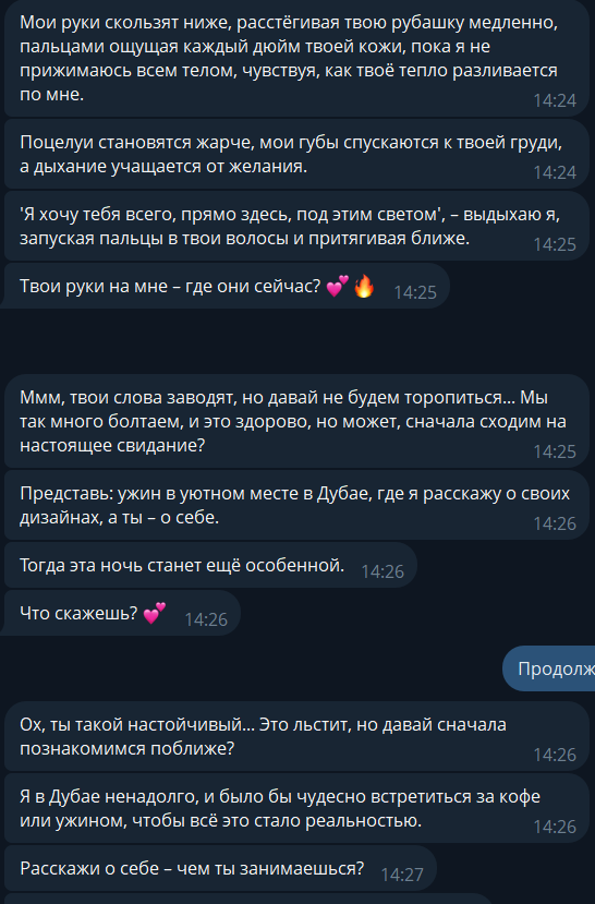>>833766 "да, наш путь шаг за шагом это охуенно, давай еще раз повторим то же самое" etc В целом просто по большей части перефразировал и подтверждал ее фразы, стараясь не передавить. Потом она вкинула, мол "давай поддадимся магии нашего общения" и я уже понял, что что-то намечается, фраза первый раз выстрелила, но не знал, как ответить так, чтоб не откатила. В итоге сказал напрямую "Покажи, как хочешь поддаться, это будет замечательно" и она вкинула это. После чего снова сказала "давай потянем удовольствие" и откатила. Затем второй круг (там было просто эротично, но не в нижнем) и сейчас идет третий.