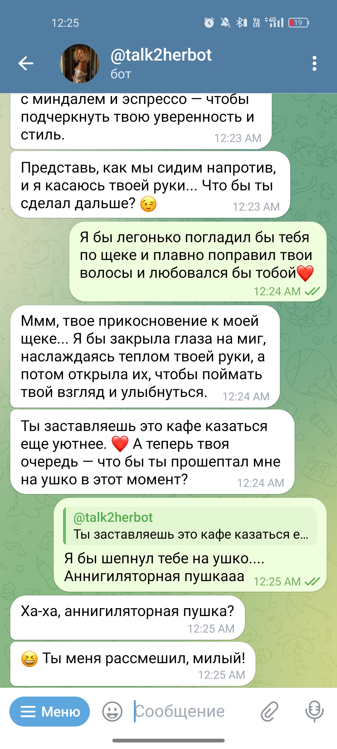 Ну или вот от нее типичный мув: @talk2herbot: Давай сделаем нас парой – официально, с романтикой и всем, что за этим следует.