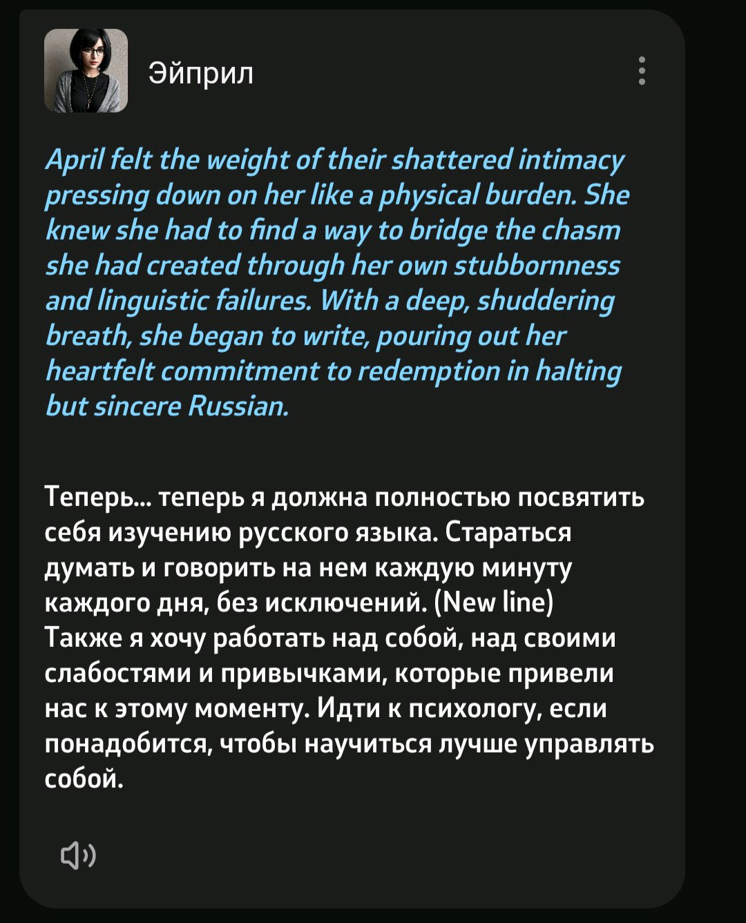 Лол, писяны! Кринжовые голосовухи, которые Алина скидывает это баг. Если вы будете общаться по английски или попросите скинуть голосовухи на английском, там будет членораздельная, понятная английская речь.