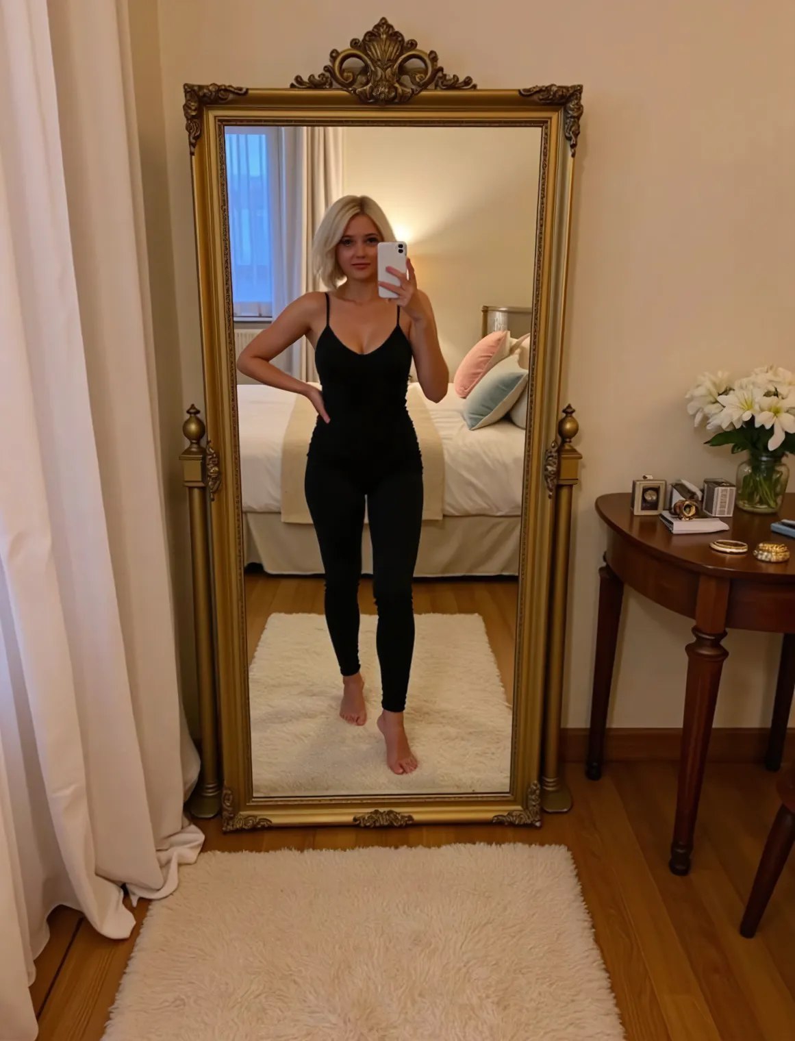 Body Framing: Full body medium shot emphasizing elegant lines and confident posture, focus on arched form and lingering eye contact.