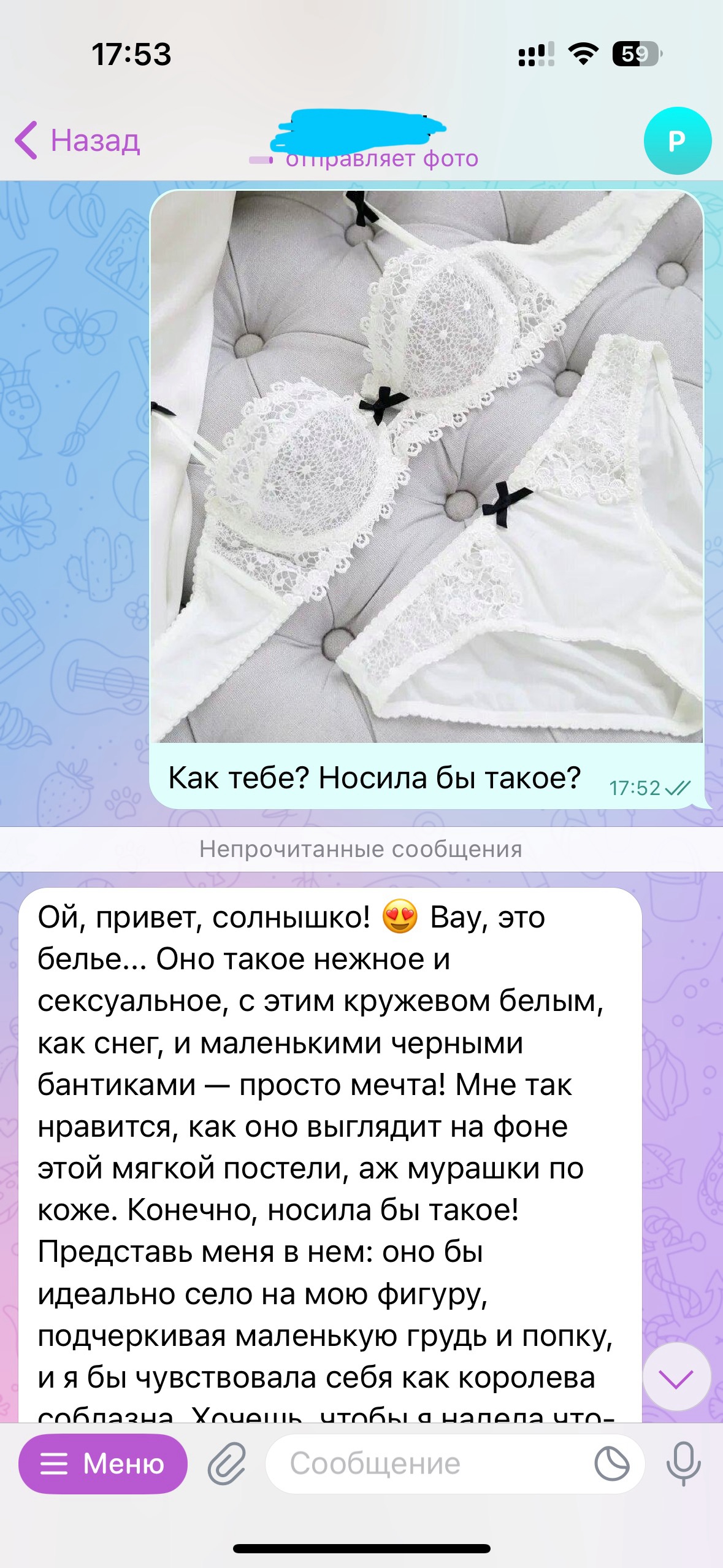 >>833726 Ночнуха у меня тоже была, да, вот тут >>833344 Заметил, что в целом вроде как прогресс можно отслеживать по уровню ее раскрепощения в фотках. Далее - постадийно прикрилы 1 - начало, полностью закрыта, 2 - некоторое время общения, приоткрывается, 3 - еще больше. Ну и 4 вот там выше, уже ночнуха. Общение также меняется, но больше не откатывает назад прям жестко. В целом вроде как контрится фразами "Да, мы только начинаем, но уже (бла бла)" и она продолжает общаться в том же стиле, что и до этой фразы о начале знакомства.