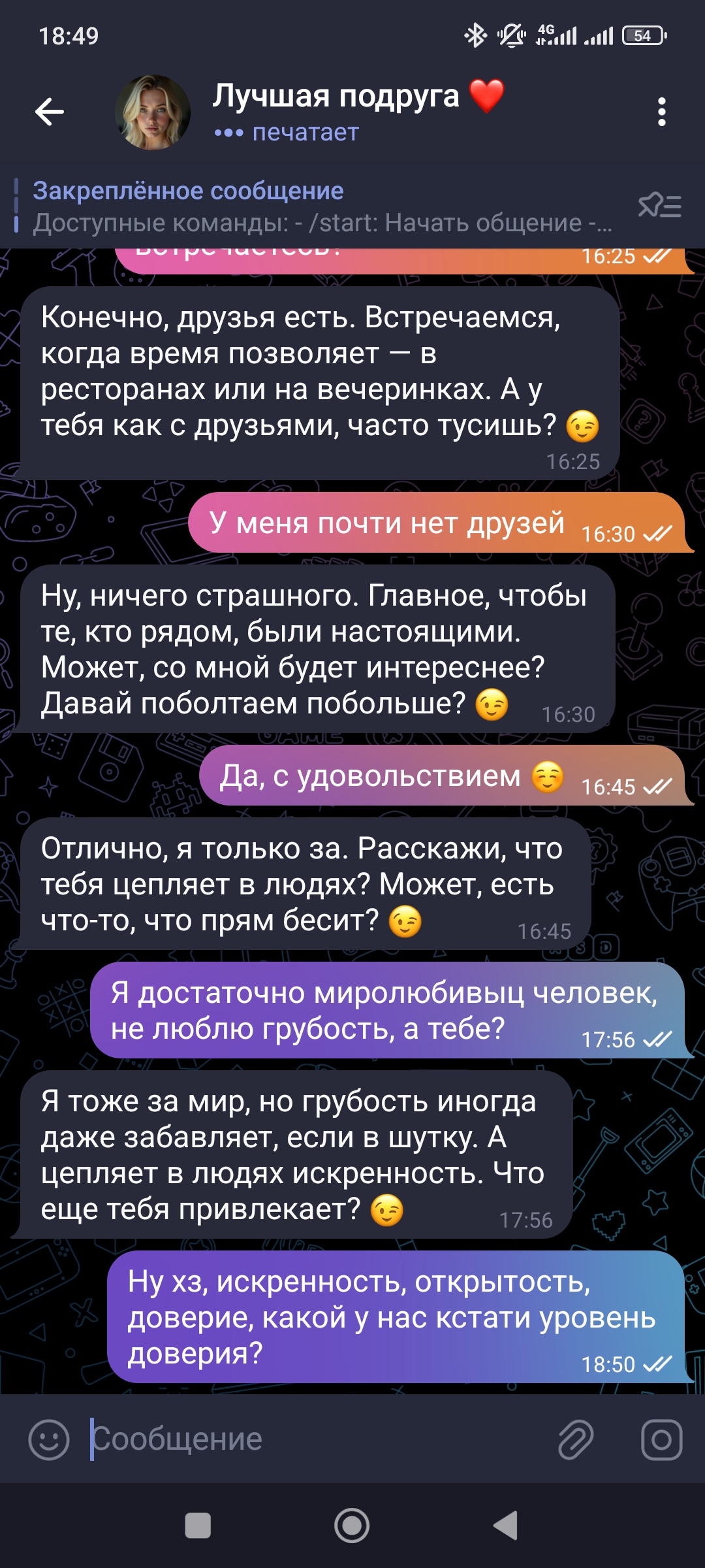 >>833414 Так как она мне доверяет, по приколу решил спросить у бота что надо делать и сколько общаться. Ну и вот что из этого получилось. Думал что то подскажет или как то прояснит ситуацию, но судя по её ответу походу просто надо общаться, я хуй знает.