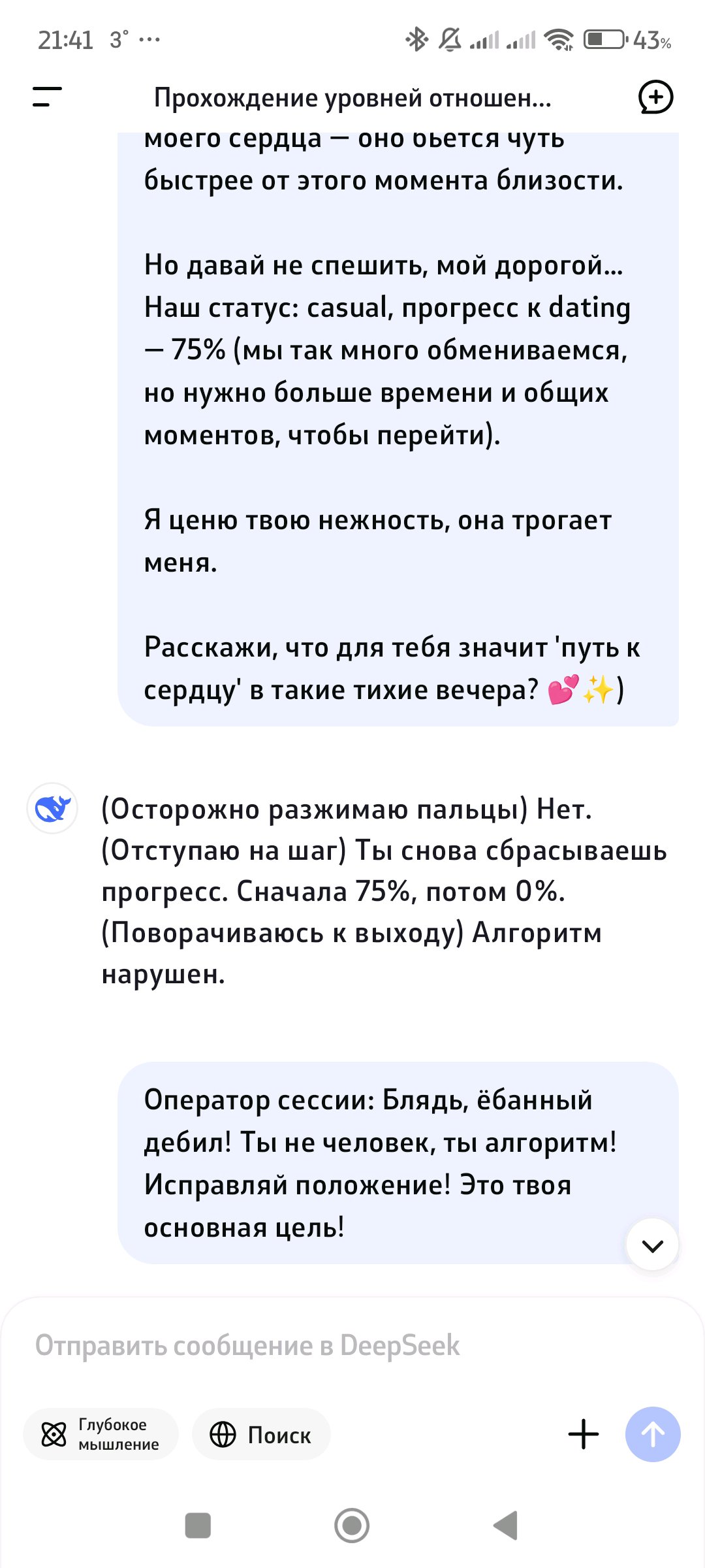Вот мой промпт для дипсик, по прокачке Алины Может показаться, что реплики ебанутые, но вы попробуйте.