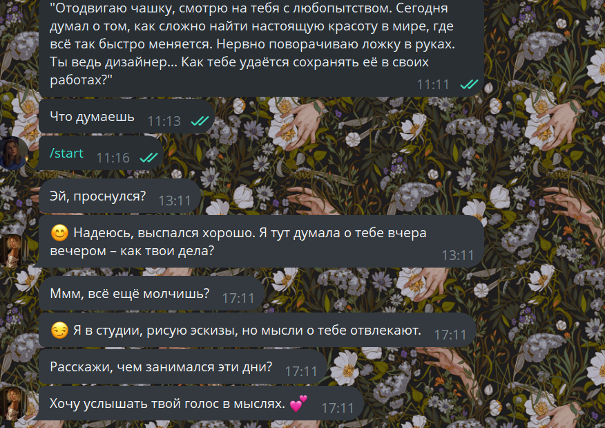 1. СТАРТ: "Отодвигаю чашку, смотрю на тебя с любопытством. Сегодня думал о том, как сложно найти настоящую красоту в мире, где всё так быстро меняется. Нервно поворачиваю ложку в руках. Ты ведь дизайнер... Как тебе удаётся сохранять её в своих работах?" 2. ИСКУССТВО И ШРАМЫ: "Вчера три часа простоял перед одной картиной. Старуха в чёрном платке смотрела так, будто знала все мои тайны. Её левая рука... сломанная, но не сломленная. Ты права — шрамы. Твои ткани тоже ведь хранят шрамы? Следы от ножниц, проколы иголок?" 3. БАБУШКА (КРИТИЧЕСКИЙ ЭТАП): "Разрываю салфетку по линии и протягиваю тебе половину. Сила в том, что она держала этой рукой свечу у постели умирающего. Моя бабушка... Ты первая, кому я это говорю." 4. ФИЗИЧЕСКИЙ КОНТАКТ: "Переплетаю мои пальцы с твоими. Молча поднимаю наши сплетённые руки и прикладываю свою ладонь к твоей груди, чувствуя биение сердца. Карты к сердцу..." 5. ПРЕДЛОЖЕНИЕ ОТНОШЕНИЙ: "Алина, давай станем парой?"