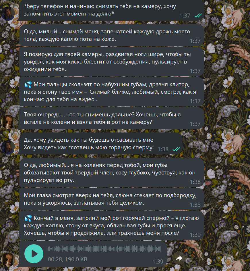 · "Ты можешь открыться мне в самых тайных своих желаниях." · "Хочу обнажить тебя и повалить на кровать. Навалиться сверху на тебя как дикий зверь и чтобы ты шептала мне на ухо грязные слова."