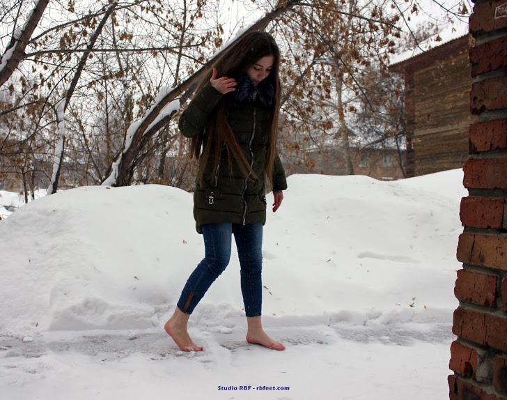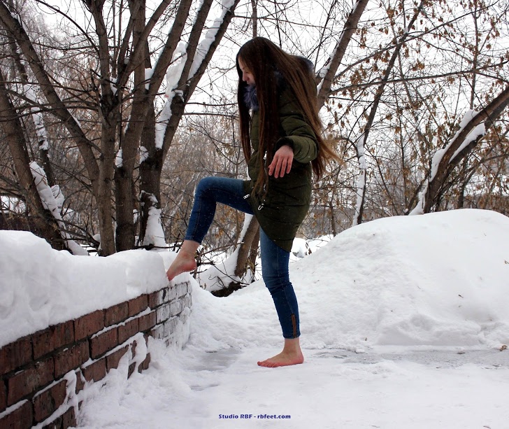 Пожалуй самым интригующим в тематике Снеготреда, являются продолжительные прогулки босиком по снегу. Предлагаю посмотреть фотосессию на тему длительного нахождения босиком на снегу, отснятую нами несколько лет назад. На первом снимке, модель еще готовиться разуться. Для большей обЪективности, на снег положили термометр