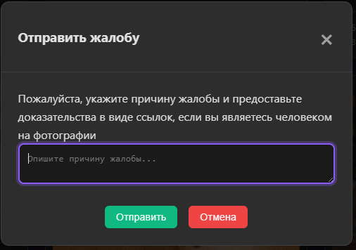 >>844639 Обновление: - Добавлена система жалоб (нажмите на ⚠ чтобы сообщить о причине) - Добавлен просмотр фото (при нажатии на фото теперь открывается просмотрщик, чтобы открыть в новой вкладке, нажмите иконку 🖼 рядом с жалобой)