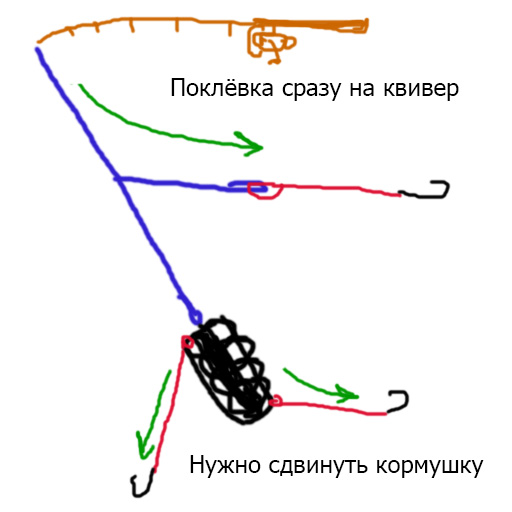 Допустим у меня прямоугольная сквозная кормушка. Я беру и цепляю крючок на поводок на основную леску как обычно. Затем к самой кормушке привязываю ещё 2 мелких поводка сверху и снизу. Одеваю на них червей и втыкаю в кашу сверху и снизу петлей внутрь кормушки. По идее рыба начнет жрать кашу и точно мимо крючка не пройдет. Норм будет?