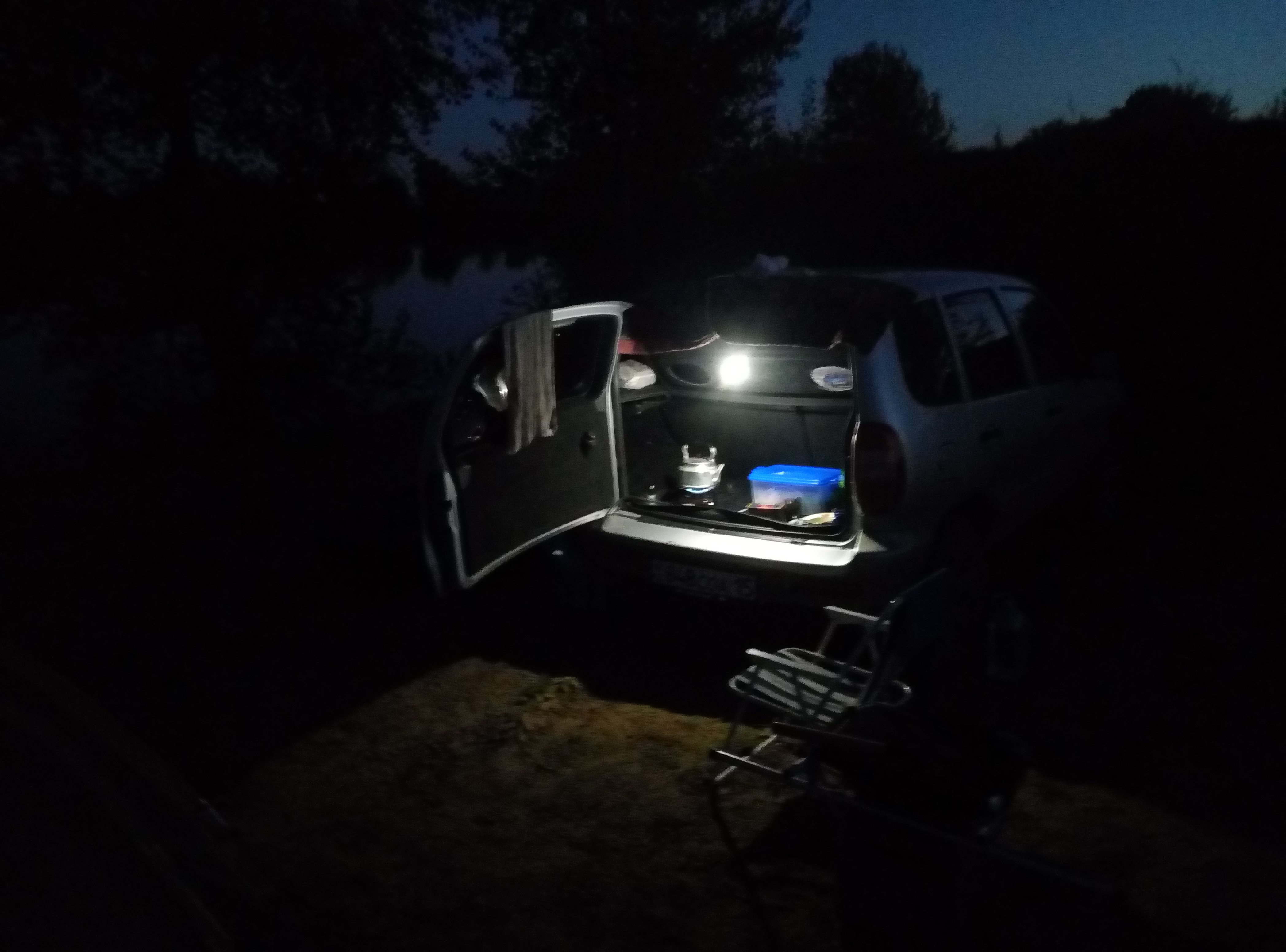Заехали ещё с вечера, пока то... сё... Разбили лагерь, расположившись в низине, в целях защиты от ветра, а там потом уже стемнело. Накачали лодки, упаковали снасти по сумка. Будильники завели на 3-30. Замерзли потом ещё немного. +2 температура была.