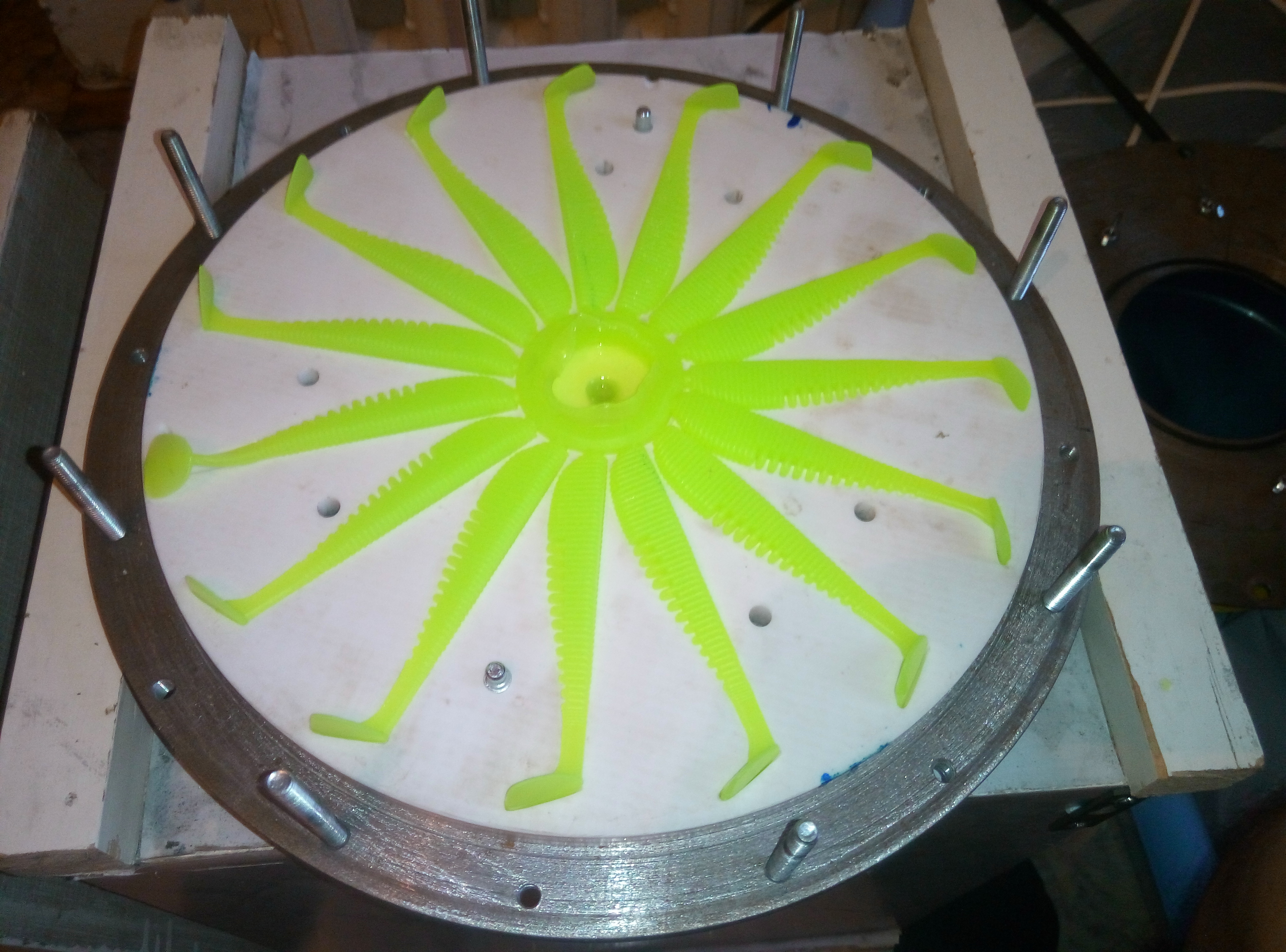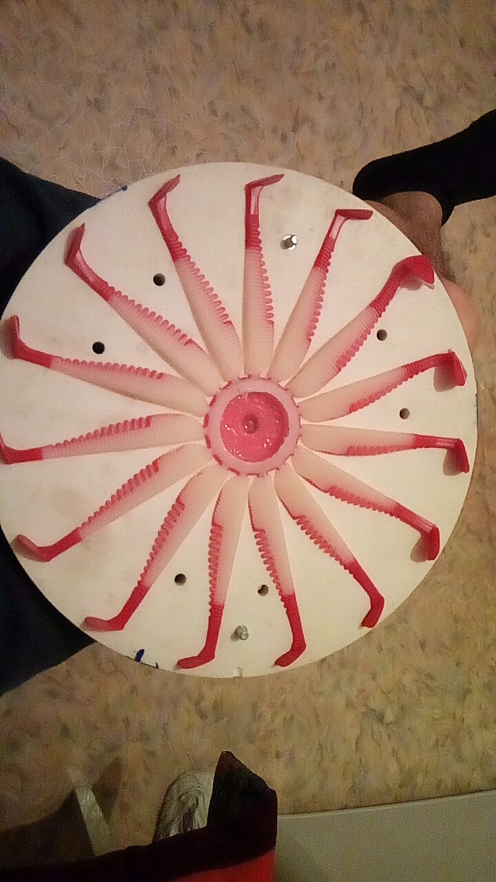 >>20556 Заливается 25-30 гр красного пластизоля и затем сразу же 150 гр белого. Центробежная сила позволяет делать границу между цветами, не смешивая их.