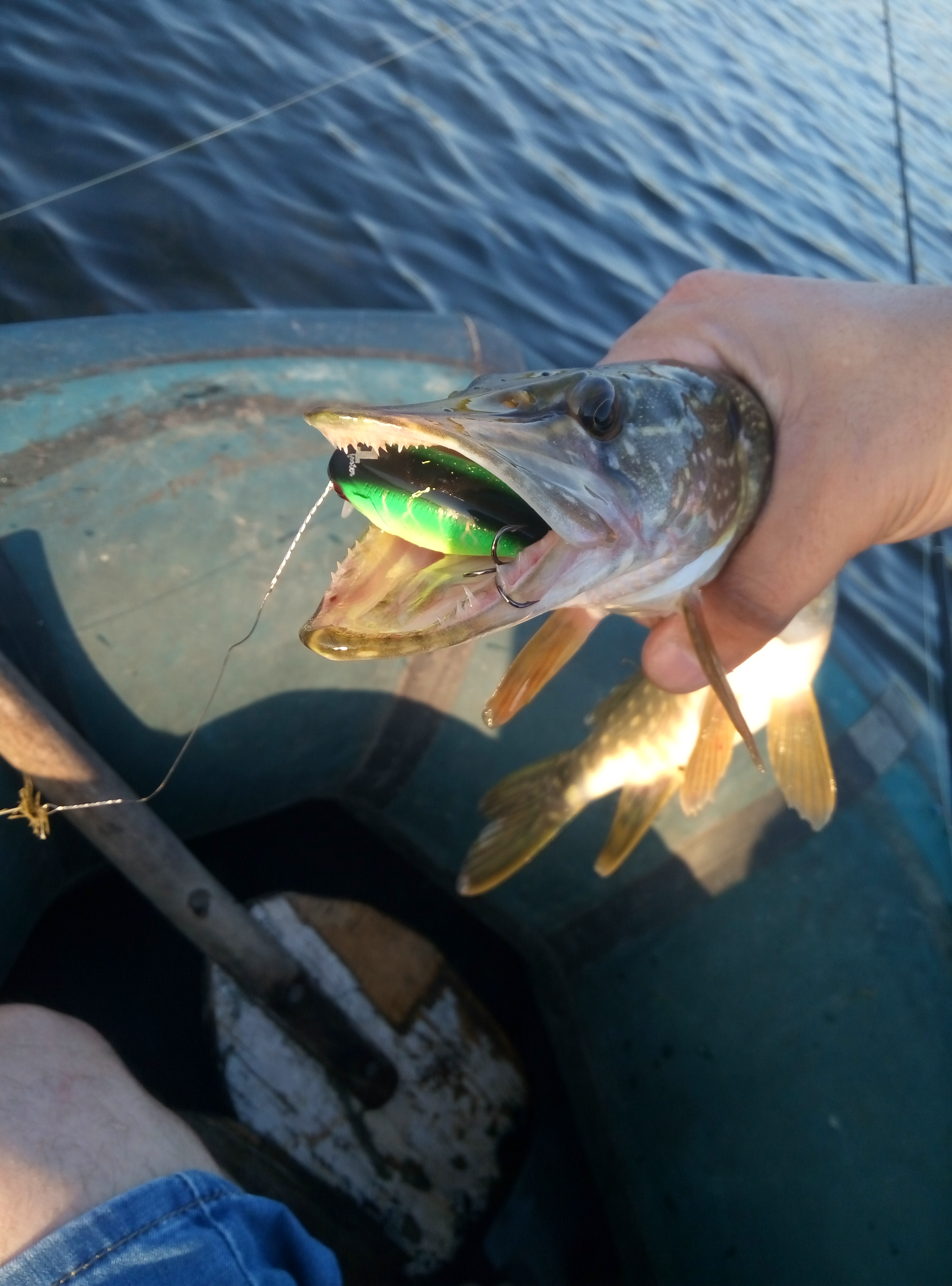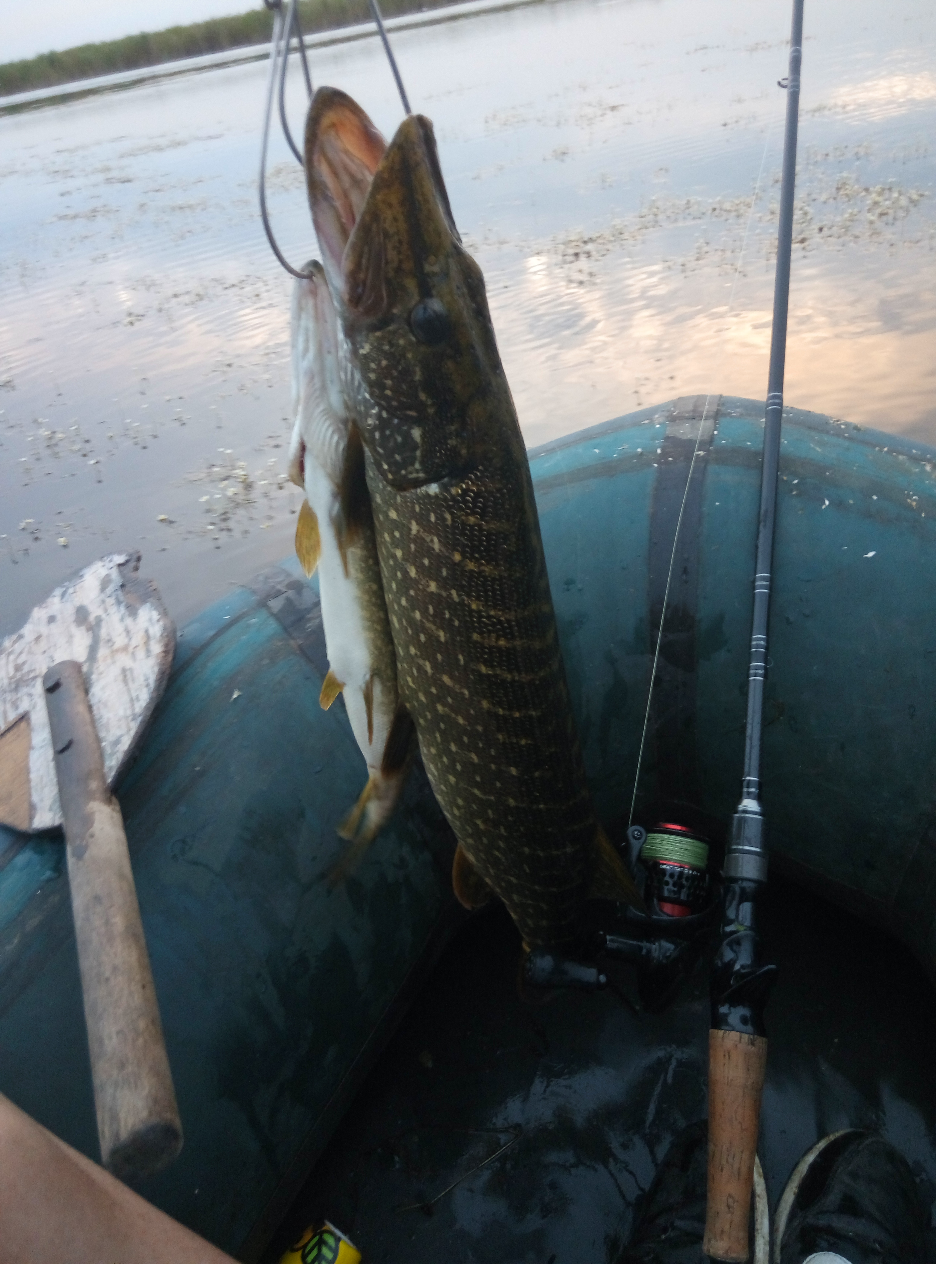 Разловил наконец-то поппер от рапалы. УРА! "Скиттер поп". Удобная штука. Ловит и набрав на тройники немного травы. Ну и видно как щука подходит к нему. Можно готовиться к вываживанию и проблем с засекаемостью нет практически. В остальное время работал составной воблер Renegade Dual 70 SP. Протяжка и пауза 2 секунды. А ещё мне в переносицу прилетела лягушка. Пришлось провести воспитательную беседу о том, что в лодке мы вдвоём находимся. Не без матов.