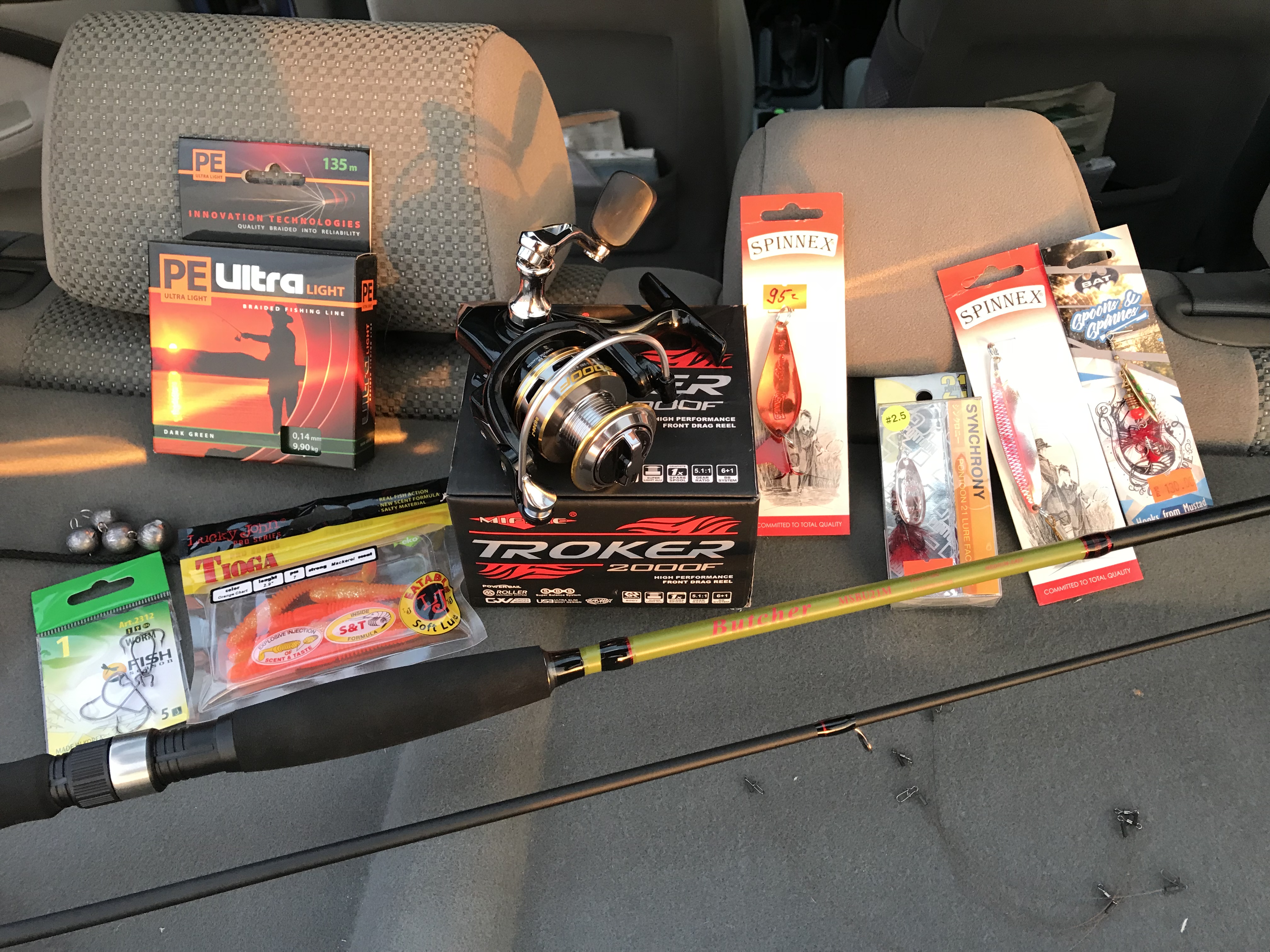 В субботу я всял и просто поехал на рынок в палатки рыболовецких принадлежностей, выбрал продавца помихалычестей, и просто вот взял и купил спининнг. Палка 5-20 2,4м, за 1700 рупелей по местным меркам шиканул, катуха за 500р, леску моно, пучок поводков, блесну-крутилку с пушком на тройнике, и пару силикошек с крючками просто блядь потому что я заступил и не знал чё ещё брать.