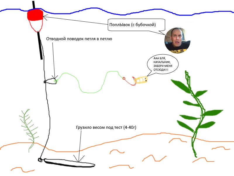 Вечер в хату, рыбаны. Обломался я тут на прошлой рыбалке с пикером и захотелось мне поплавков. Придумал такую снасть (прикреплейтед). Прикармливаем (или нет) рукой, рогаткой или ФИРМЕННЫМ КАТЕРОМ ЗА 250 БАКСОВ, а затем, промерив глубину, делаем заброс. Грузило-палочка 10-20-30г. падает на дно и держит снасть, а чувствительность обеспечивает непосредственная связь поводка и ПОПЛЫВКА. Как мне кажется, это объединяет преимущества поплавочной снасти и фидерной - можно делать заброс на 20, 40, 50 метров и смотреть на ПОПЛЫВОК С БУБОЧКОЙ. Как вам? Нравится? Есть идеи по улучшению? Может, тоже попробуете такое? Сам пока не пробовал, но протестирую на выходных.