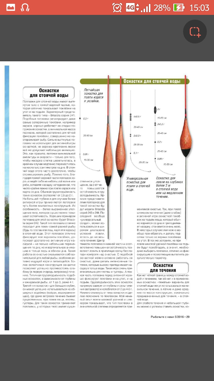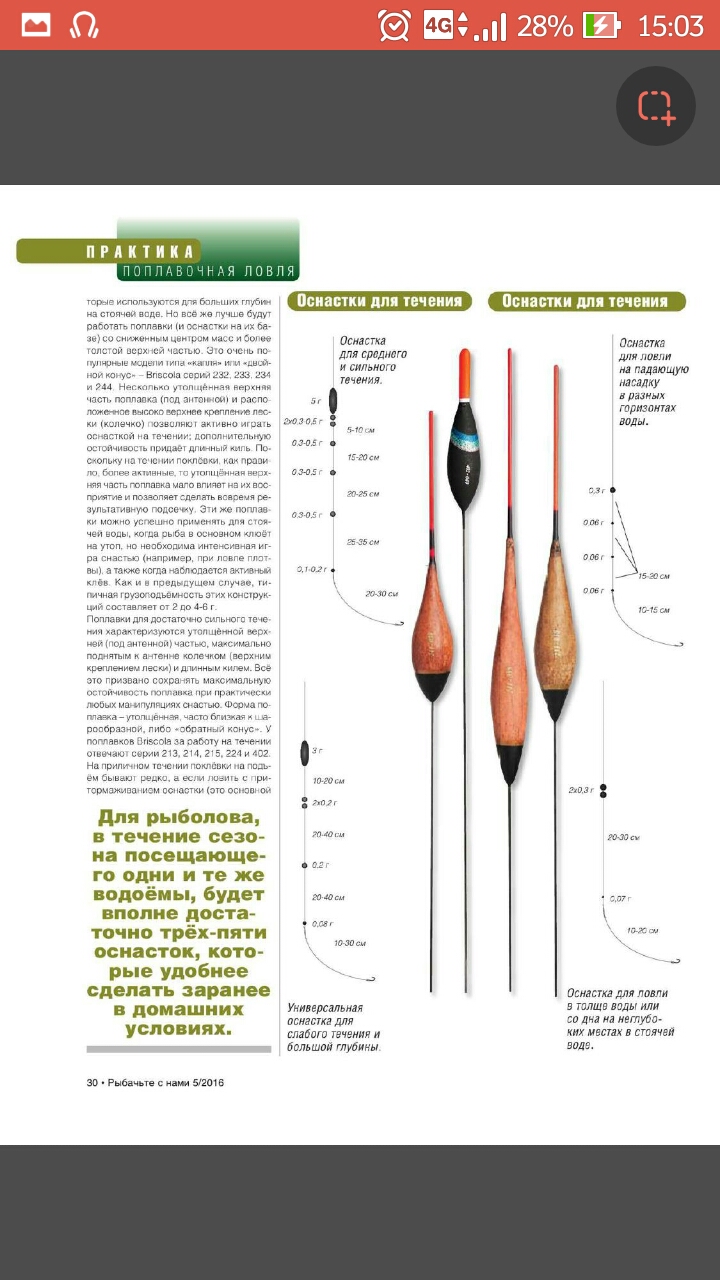 Для более комфортной и результативной рыбалки рекомендуется всё же следующий комплэкт: -Лёгкое карбоновое удилище либо маховое, которое легче, либо болонское с кольцами и катушкой, которое тяжелее, но проще в эксплуатации, длиной 4-6 метров в среднем. Стоимость обычно 1000-3000 деревянных. -Леска диаметром 0,16-0,14 мм, желательно фирменная, например Trabucco, Cralusso, у совсем дешёвых может не совпадать заявленный диаметр. Желательно делать снасть с поводком меньшего диаметра (на 0,02 мм) нежели основная леска на случай обрыва снасти, чтобы сохранить поплавок и грузила. Но можно делать снасть и полностью на леске одной толщины. -Крючки лучше Owner, Gamakatsu или другие Японские. Общее правило - крючки должны быть очень острыми и достаточно прочными, чтобы не происходило разгибаний, либо обломов, т.е. должен соблюдаться баланс твёрдости. Для поплавочки подойдут номера 18 (савсэм мали), 16-14 (годнота) и иногда 12, если наживка большого размера, как соответственно и рыба. -Грузила в целом подойдут любые, но лучше брать фирменные, они и сделаны качественно и с весом не объёбывают. -Для любителей маха понадобятся ещё и мотовильца, чтобы сматывать на них снасть. А также коннекторы для удилища. -Поплавки отличного качества - Colmic, Cralusso. Но можно и более бюджетные типа Atemi. Главное не совсем дешёвые, формой типа перевёрнутой капли и грузоподъёмностью 1-2 г для ловли не далеко от берега. С увеличением дальности увеличивается размер и грузоподъёмность поплавка.