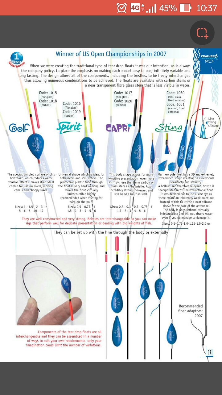 Я когда мах купил разных поплавков купил, но сейчас, по сути, только два типа использую. Кралуссо как на пике 1 для всего и поплавки с длинной мачтой, для поклевок на подъем - пик 2. Кралуссо идут со сменными вершинками, и вообще это поплавок-конструктор, купив за 160 рублей вот такой набор, как на пике 3, можно что угодно собрать. Поплавки совершенно неубиваемые. Веса поплавков - 1,5-2 грамма, если тихо, 3 грамма, если ветер.