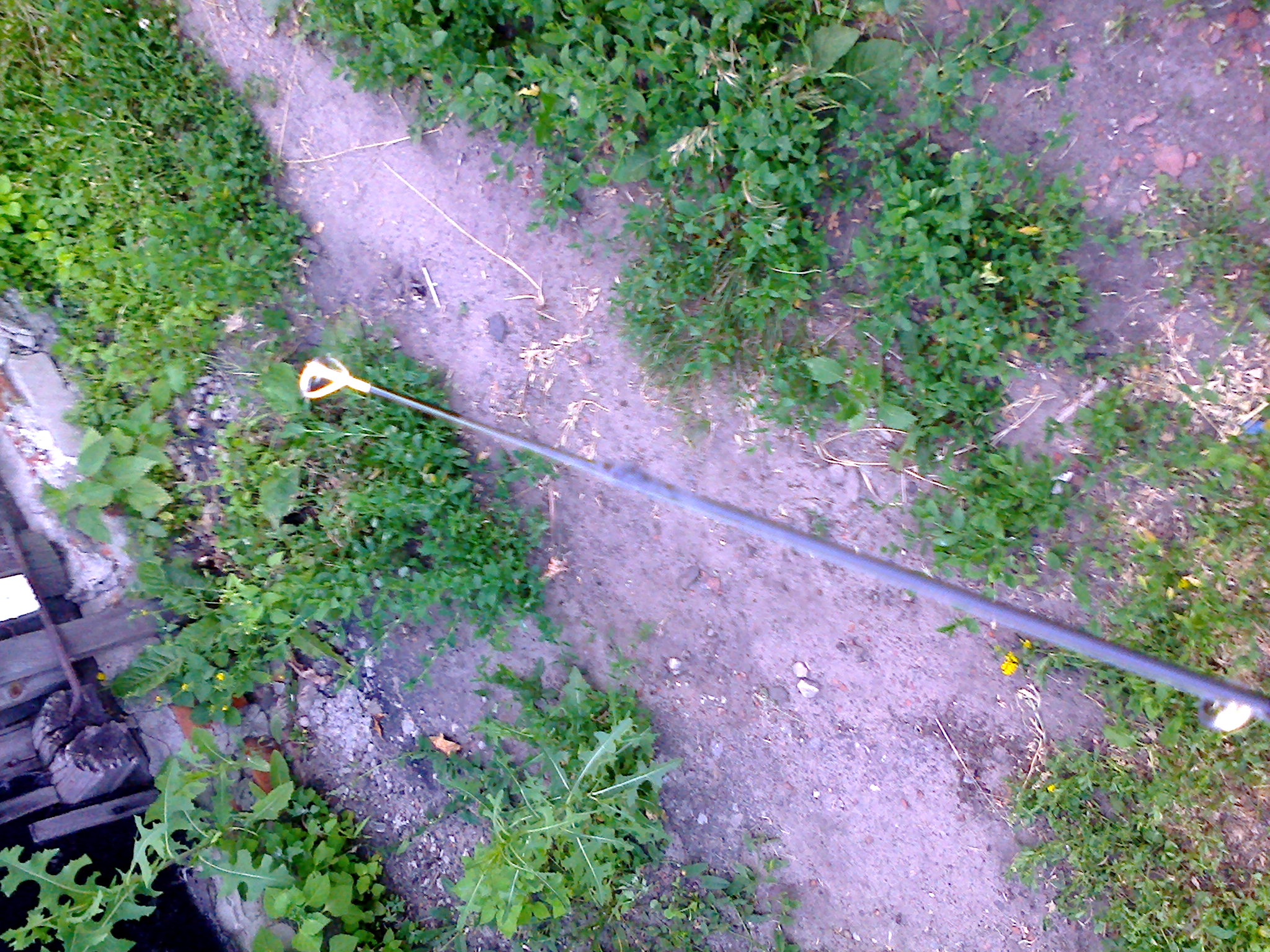 Что за махалка? У меня, как оказалось, каноничная лоховская удочка. Стеклопластик с кольцами, дешевая безинерционная катушка, толстая леска и поплавок с пимпочкой-бубочкой. И крючок номер 7.