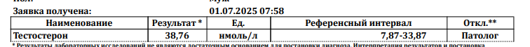 >>2599143 Здарова всем Закончился курс, 2 мес по 25мг каждый день, по назначению врача. На скрине результат общего теста, натощак с утра, спал 6 часов +секс