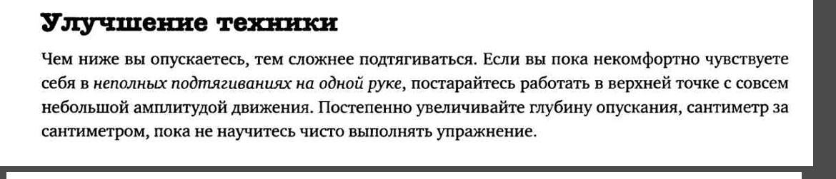 Подтягивания: - На одной с низкой поддержкой. Можно назвать это уровнем 7.5 Держусь рукой не за запястье, а за основание предплечья у локтя. Если 7 делался более-менее нормально с одного хвата, то тут регулярно спрыгиваю и продолжаю. Уровень 8 Уэйда - лютейший бред, он несравнимо сложнее его же 9го из книги. Дальше планирую перенести опорную руку на плечо