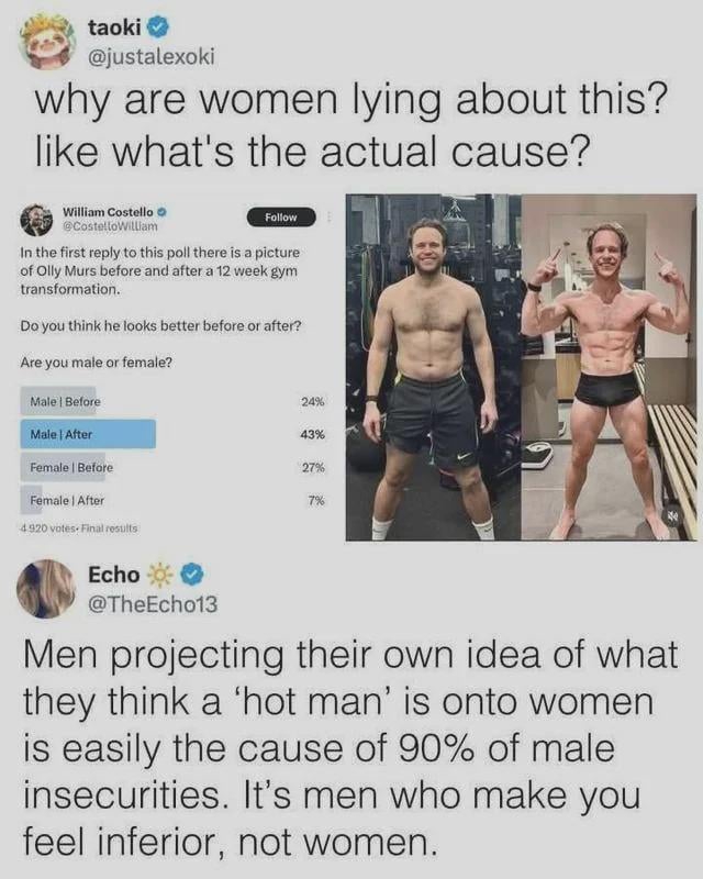 >>2498131 >Девчонки чаще смотрят? >>2498146 >Либидо упало, но девочки обращают намного больше внимания, это факт >>2498243 >Так на тёлок у него либидо и упало, вот и приходится пидорас жопы рвать. >>2498635 >Так девушки не дадут секс если у меня будет больше 10% жира в теле >>2514217 >тренишься, а в итоге бабам на тебя похуй >>2540251 >Бабы нихуя не понимают в мужской красоте