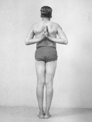 Делать у стены стоя. Прижимаешься пятками, ягодицами, спиной и головой (ну само собой еще руки в таком положении будут касаться стены, но это издержки). И стоишь. Главный момент - держи ягодицы в напряжении, своди их (вперед), чтобы таз назад не отклячивался, и в то же время локти старайся наоборот завести назад максимально, и плечи туда же - старайся их развернуть параллельно стене и максимально отвести назад, прижать к стене.
