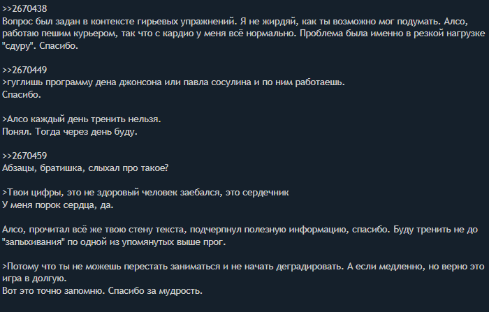 >>2670428 > с непривычки словил перетрен и чуть не умер с давлением 170/90 Это не перетрен. Перетрен это регулярная, сильная усталость продолжительное время. И ты не успеваешь восстанавливаться и начинаешь тренить опять. Лично у меня было от базы со штангой через день. Всегда в отказ. Нууу, через две недели проходя мимо штанги начиналась тошнота в прямом смысле. Всего ломает, усталость. Частоту уменьшил, питание увеличил стало лучше. Еще цепляешь косяки, координация движений нарушена. В общем то, за что и отвечает Центральная Нервная Система. Это и есть переутомление ЦНС. Кстати аппетит тоже падает. Но я был худым 70/183. И что-что, а давление ничего не меняло. Не то что гиря или штанга, а даже 0.7 водки. В прямом смысле проверял во время распития и на утро 120/80. Хотя я давление чувствовал, когда дней 5 подряд кофе зерновой пил по несколько раз в день из термокружки 0.4 л. И то я давление не мерял, но чувствовал, что это оно. Даже нос дышал хуже. Как сузился возуховод. В твоем случае надо вкатываться плавно. У тебя проблемы с давлением. Это 146%. Твои цифры, это не здоровый человек заебался, это сердечник. И как мне показывают мои наблюдения тебе надо это фиксить. А потом тренить. Первое дело это питание. Убери соль по максимуму. С нее отеки и давление. Я это наблюдал два раза. В одном случае инфаркт в другом инсульт. Соль это консервы. Рыба соленая и х/к и сушеная. Соленья само собой. Там ее так дохуя, что на следующий день человек всегда охуевает от отеков и давления. Таблетками сбивает, но причину не устраняет. Что с гирей? Тренить спину первое. Ноги второе. Ручки на последнем месте и сами дойдут. Не вырастут ручки. А просто оформится рельеф и будут значительно сильнее, чем до. Спина это самое важное. Это фундамент. И если слабая или повреждена тебе уже нахуй не нужны не ручки не ножки. Ты будешь лежать и уколы в жопу ставить. Ноги часто забывают. А это залупа. Ноги надо тренить, в них много мяса и крови и когда их тренишь кровь гоняется и заебись. Да и ходить будешь не уставая. Исходя из таких соображений я оставил несколько упражнений. Рывок. Спина, низ поясницы становится крепким, спина перестала уставать. Предплечья окрепли. Дыхалка, очень важно для тебя, сильно улучшилась. Кубковые приседания. Ноги и руки на удержание. Трастеры. Универсальное упражнение, но сходу может не пойти. Работает все тело. Исходя из твоего давления надо тренить по малу повторений, делать передышку и повторять. Поначалу не доводить до запыхивания. При умеренной нагрузке с давлением ситуация улучшится. Ключевое слово умеренная. Те цифры которые ты написал однозначно ведут к инфаркту или инсульту. Тут к врачу надо. Сделал подход отдохнул до полного восстановления сделал еще... Здоровому не надо до полного. Тебе надо. И делай чере два дня. До 3 раз в неделю. Прогресс будет при регулярном занятии. Если рывок не осилишь делай махи. Насчет заниматься каждый день это ты загнул. Ты скорее всего заебешься через месяц другой и забьешь. Намного лучше 2-3 раза в неделю, да даже 1 раз, но годами и до конца. Потому что ты не можешь перестать заниматься и не начать деградировать. А если медленно, но верно это игра в долгую.