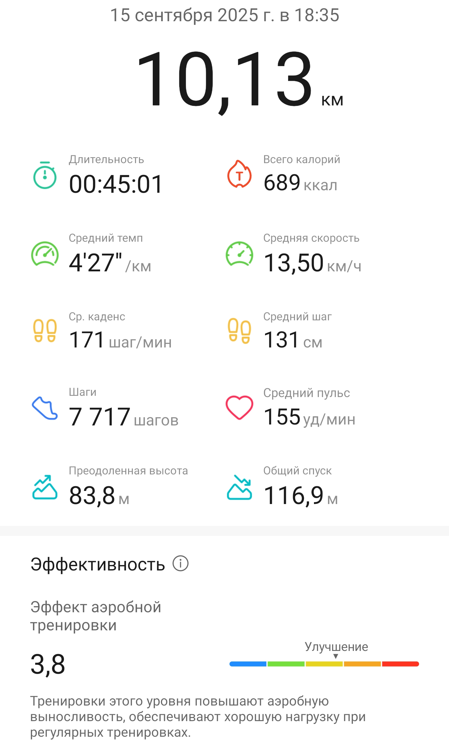 Давно хотел попробовать 400 метров. Длинный спринт. Ну и вот сделал сразу норматив третьего юношеского разряда. Значит форма никуда не делась, хотя с осени я меньше делаю быстрого бега и больше бегаю умеренно и медленно. Но те быстрые пробежки что я делаю - они всё-таки работают. Это классно.