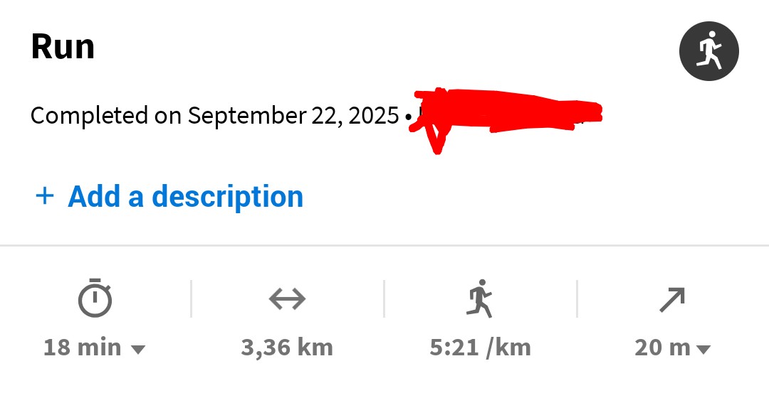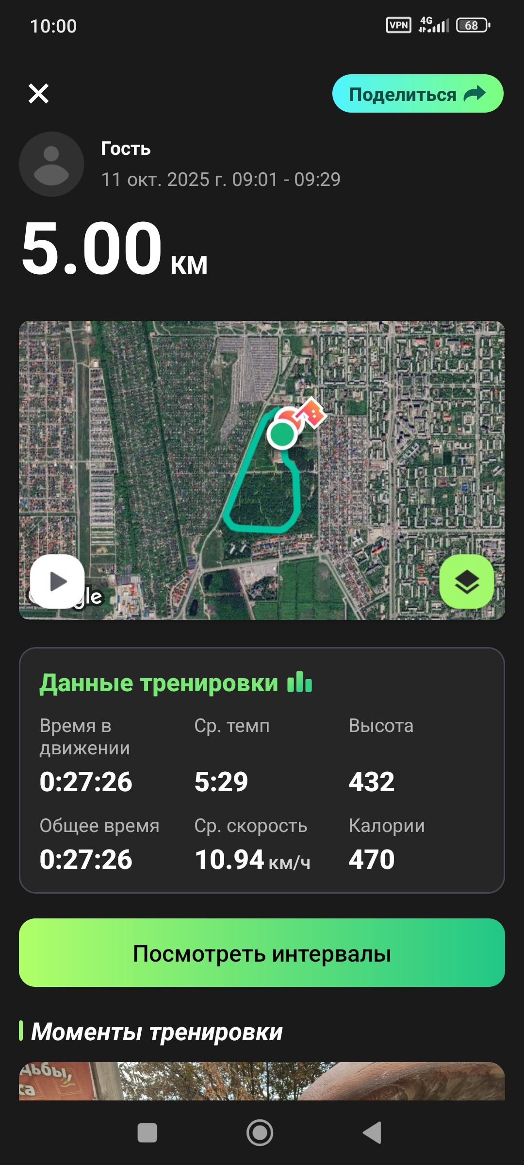 Часы определяли темп и дистанцию с выключенным GPS, поэтому точность ниже. Если для бега ещё темп более-менее точный (но всё равно на 30-40 секунд выше, чем обычно для таких интервалов), то для ходьбы между интервалами часы безбожно врут - показывают темп ходьбы раза в 2 больше, чем обычно. Возможно, из-за того, что данных по бегу намного больше, чем данных по ходьбе.
