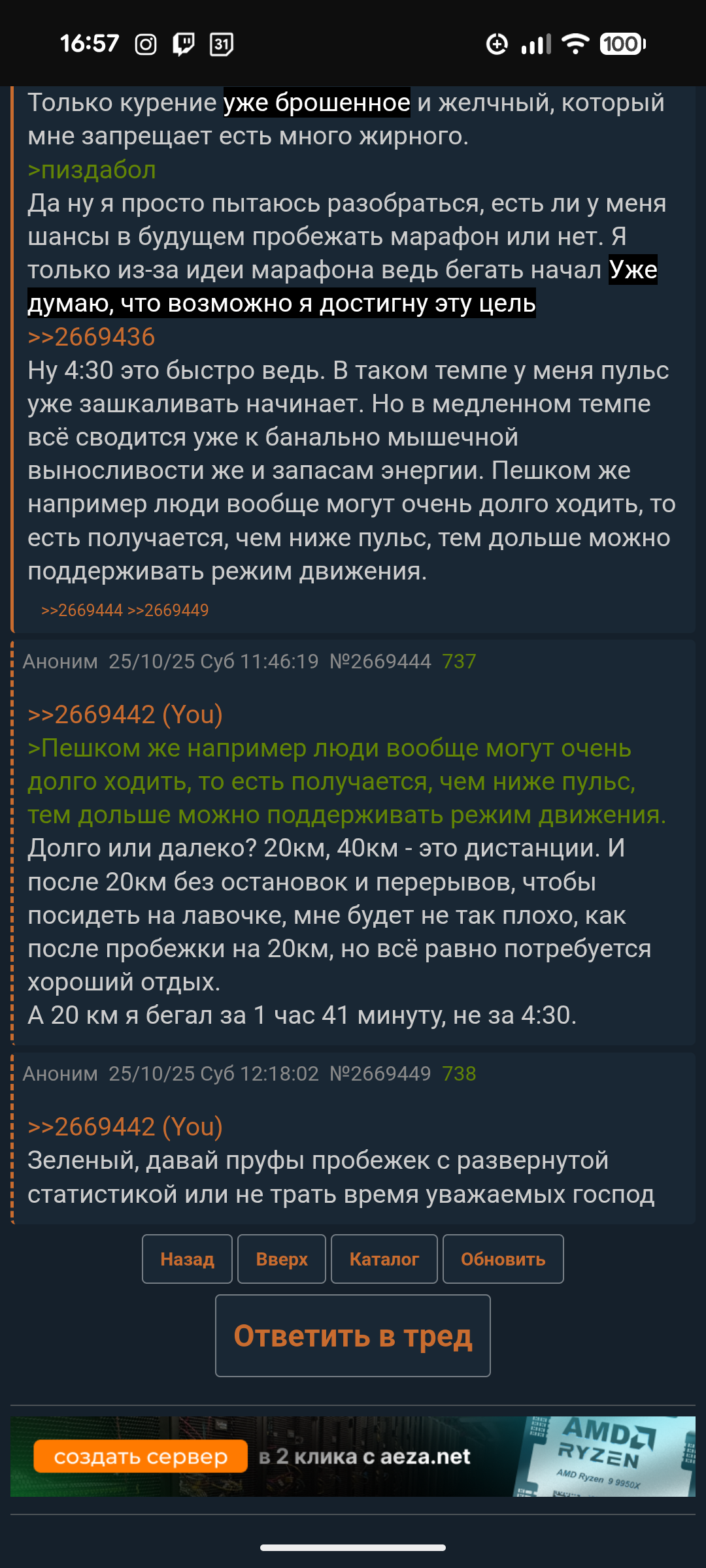 Завтра не побегу, т.к. буду стирать одежду беговую, а у меня и кофта и штаны сделаны в основном из ебучего коттона, который сохнет долго, тяжёлый и холодный. Надо нормальными шмотками будет обмазаться в будущем, т.к. это всё никуда не годится. >>2672412 >весишь на 15 кг меньше меня и у тебя ноги более сильные из-за физической работы. Вес да, насчёт силы ног не знаю. Я на днях писал, что приседал с 75 килограммами челикс один на спину залез и это ощущалось, что кочки называют "рабочий вес", то есть моя сила на 1 реп макс это с соточкой присесть примерно. Это не много же, всякие дядьки столько от груди жмут без проблем на много раз. Так что этот анон >>2672603 думаю прав, что тут явно ничего около спортивного даже нет в моей физухе. Ещё и скинни фэт же >>2672567 Про генетику я предполагаю, а гулять 10-20 километров изредка это дохуя физухи не прибавит, мне кажется, что литералли любой, кроме людей с ожирением может без проблем столько ходить. >12 лет вольной борьбы Вообще на стоит эти вещи сравнивать, вот скажем, если бы я велосипедистом был активным и часами бы катал, то это бы был фактор, влияющий на беговые результаты. Ну или рил если спортом каким-то заниматься, то это могло бы считаться перекатом из спорта в спорт. А тем временем у меня ещё дебаффы в виде курения с эпизодическими перерывами и желчного и два три килограмма абсолютно ненужного жира ещё на себе таскаю визуально около 20% жирность у тела Алсо, батя был только в пиздючестве хоккеистом и на более высокий уровень, чем сборная области, никогда не попалал.
