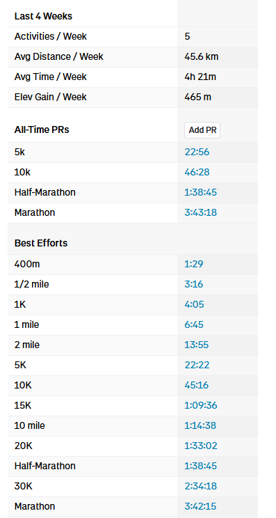 ~10 месяцев бега с нуля, курил до этого больше 10 лет, вот восстанавливаю теперь лёгкие и здоровье. Нарочно не выдавливал из себя максимальную скорость, но наверное стоит, чисто чтобы увидеть на что способен. А вообще смотрю и как-то грустно выглядят эти "рекорды", мне кажется за почти год можно было достичь значительно больше.